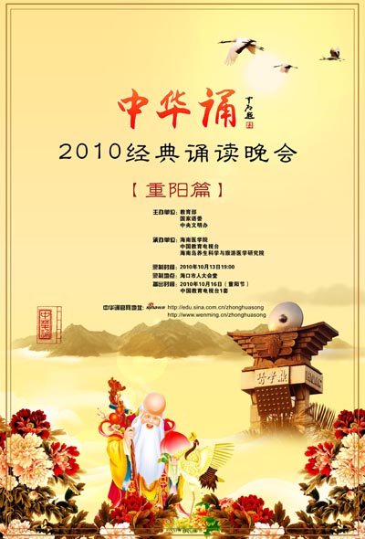 记者获悉,由国家教育部、国家语言文字工作委员会、中央文明办主办,海南医学院、中国教育电视台、海南岛养生科学与旅游医学研究院承办的“中华诵•2010经典诵读晚会(重阳篇)”将于10月13日晚在海口人大会堂录制,10月16日(重阳节)在中国教育电视台一套播出。届时,众多国家著名话剧表演艺术家、影视明星、歌星、播音员如张家声、曹灿、肖雄、满江等将与我校师生同台演出;国内多家媒体将对晚会进行报道 。(www.edu.sina.com.cn/zhonghuasong www.wenming.cn/zhonghuasong)