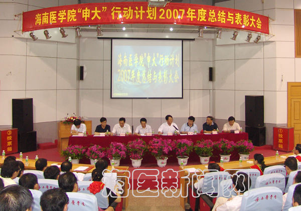 我校申办医药大学工作正在紧张而有序地进行中。为进一步总结经验,表彰先进,推动工作,2008年4月10日下午,我校在多功能报告厅召开“申大”行动计划2007年度总结与表彰大会。大会由学校党委书记李永春主持。学校领导焦解歌、曾渝、刘军保、陈志斌、何忠平、孙公凯、肖玉明等出席了大会,全校行政副科级以上人员及副高职称以上人员参加了大会。