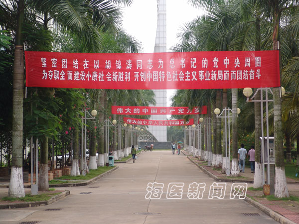 据悉 ,10月11日,海南医学院校园内挂起了迎接十七大的大红横幅,处处洋溢盛会喜庆氛围,把整个校园装扮得格外美丽。为让师生及时学习十七大精神,学校将在盛会期间开放校内所有电视,让师生们都可收看十七大盛况。