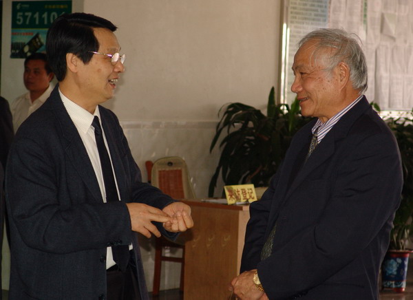 学院院长焦解歌 (左)与印尼海南总商会主席李兴福先生亲切交谈(右)