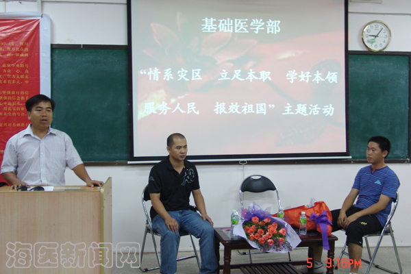7月5日晚9:00,基础医学部“情系灾区 立足本职 学好本领 服务人民 报效祖国”主题活动于3-301教室举行,活动由基础医学部黄泽云老师主持。参加本次活动的有基础医学部党总支周代锋副书记及07级生物技术本科班的全体同学。活动邀请了从抗震救灾前线归来的两位校友为大家做抗震救灾事迹报告,他们分别是文昌市疾病预防控制中心的史岸军科长、三亚市卫生监督所的吴伟医生。