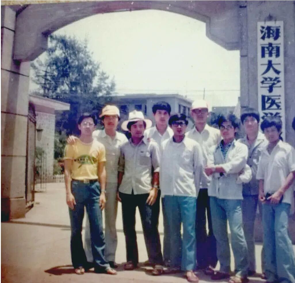 倡议发出的当晚(10月20日凌晨),李敏校友便率先传来喜讯,他在个人相册中找到了首张关键照片——五名学生在“海南大学医学部”门牌前合影,笑容灿烂,青春洋溢。这张照片成为首份被发现的、证实该时期校门面貌的关键影像,为寻档工作取得了至关重要的突破。