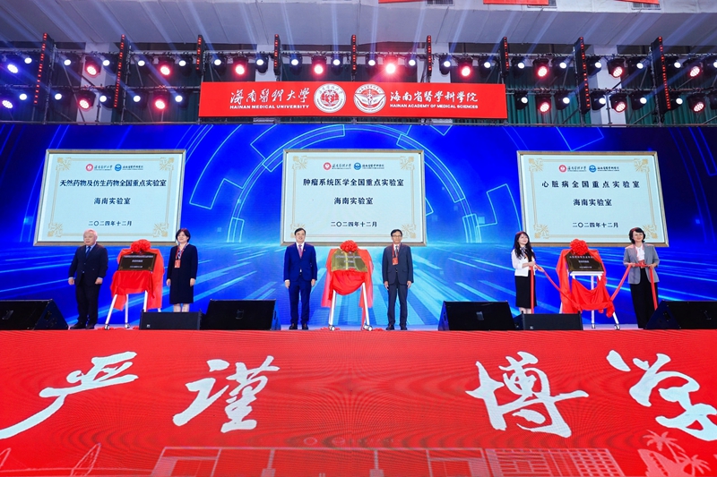 大会还举行了全国重点实验室海南实验室揭牌仪式。北京大学、复旦大学、上海交通大学医学院等兄弟院校在我校设立的天然药物及仿生药物全国重点实验室海南实验室、肿瘤系统医学全国重点实验室海南实验室、心脏病全国重点实验室海南实验室等三家全国重点实验室海南实验室正式揭牌成立,标志着海南医学科技创新水平将迎来一个飞速发展提升的阶段。