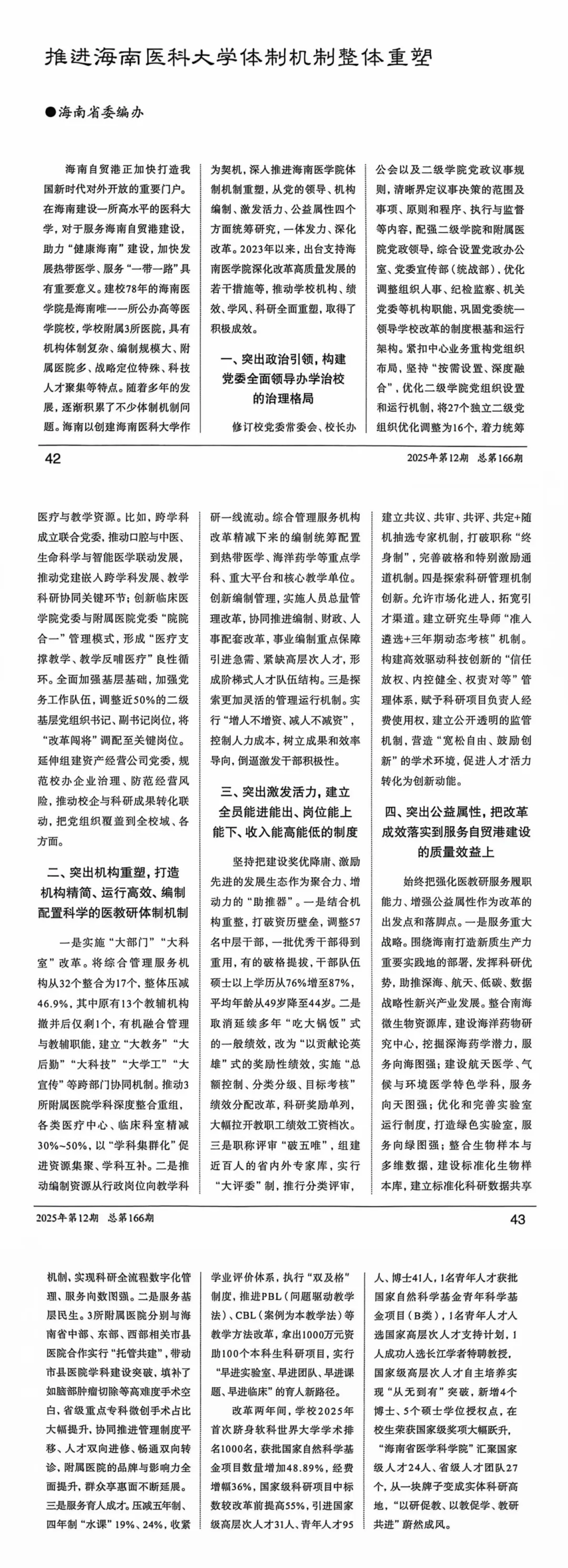 近日,《中国机构编制》刊发海南省委编办撰写的文章《推进海南医科大学体制机制整体重塑》,对我校体制机制改革进行专题介绍。海医体制机制改革紧扣政治引领、机构重塑、活力激发、公益属性四大重点,靶向破解发展堵点,全力贴合自贸港建设与民生保障需求,学校治理效能、办学实力、科研发展、人才引育均实现跨越式提升,探索出一条既切合海医实际,又可借鉴的高校治理新路径。