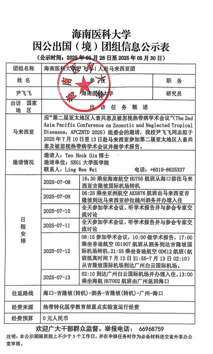 海南医科大学因公出国(境)团组信息公示 尹飞飞1人赴马来西亚团