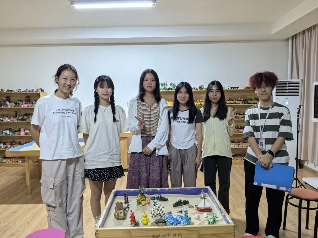 同学们看着沙盘上的小小世界,看着自己的创造,脸上都洋溢着开心的笑容。活动的最后,同学们都与自己组的沙盘世界进行了合影留念,有些同学还拿出了自己的手机进行拍摄,保存下这一刻的美好时光。
