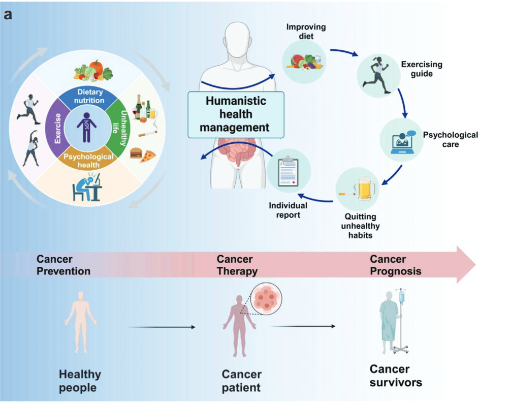论文摘要:The incidence rate of cancer is increasing year by year due to the aging of the population, unhealthy living, and eating habits. At present, surgery and medication are still the main treatments for cancer, without paying attention to the impact of individual differences in health management on cancer. However, increasing evidence suggests that individual psychological status, dietary habits, and exercise frequency are closely related to the risk and prognosis of cancer. The reminder to humanity is that the medical concept of the unified treatment plan is insufficient in cancer treatment, and a personalized treatment plan may become a breakthrough point. On this basis, the concept of “Humanistic Health Management” (HHM) is proposed. This concept is a healthcare plan that focuses on self-health management, providing an accurate and comprehensive evaluation of individual lifestyle habits, psychology, and health status, and developing personalized and targeted comprehensive cancer prevention and treatment plans. This review will provide a detailed explanation of the relationship between psychological status, dietary, and exercise habits, and the regulatory mechanisms of cancer. Intended to emphasize the importance of HHM concept in cancer prevention and better prognostic efficacy, providing new ideas for the new generation of cancer treatment.