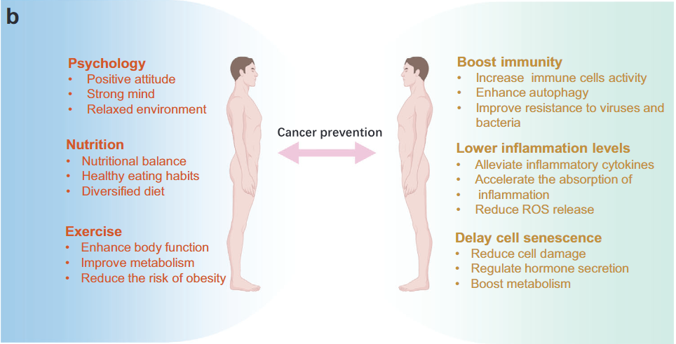 王艳丽课题组的李晨晨等人在国际知名期刊《Advanced Science》(影响因子15.1)上发表题为“Humanistic Health Management and Cancer: Associations of Psychology, Nutrition, and Exercise with Cancer Progression and Pathogenesis”的论文。