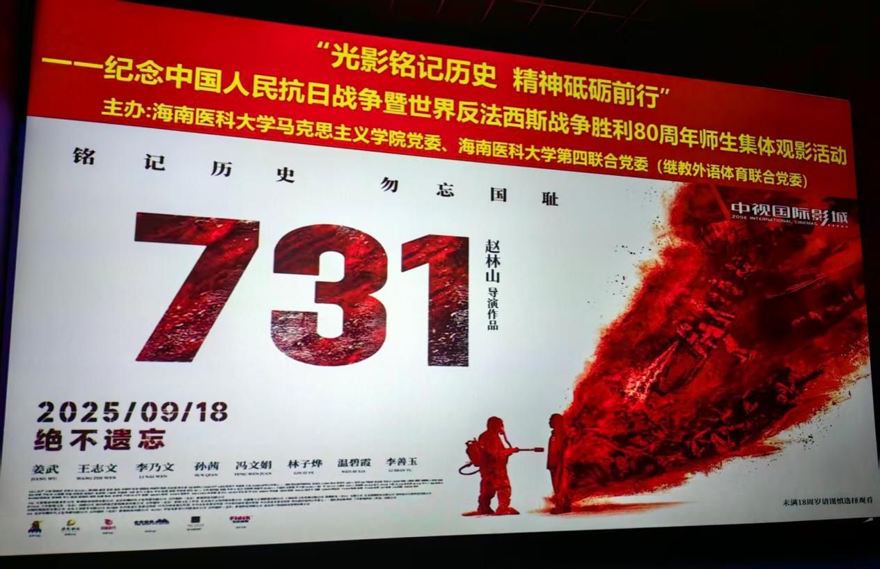 2025年9月18日晚,海南医科大学马克思主义学院党委与第四联合党委(继教外语体育联合党委)共同举办的纪念中国人民抗日战争暨世界反法西斯战争胜利80周年师生集体观影活动在中视国际影城(喜盈门店)3号厅顺利开展。马克思主义学院党委书记王身坚、院长周书俊,第四联合党委书记常彩红、体育部主任陈基成等学院领导以及马克思主义学院、继续教育学院、外语部、体育部教职工和研究生代表等120余名师生参加观影。