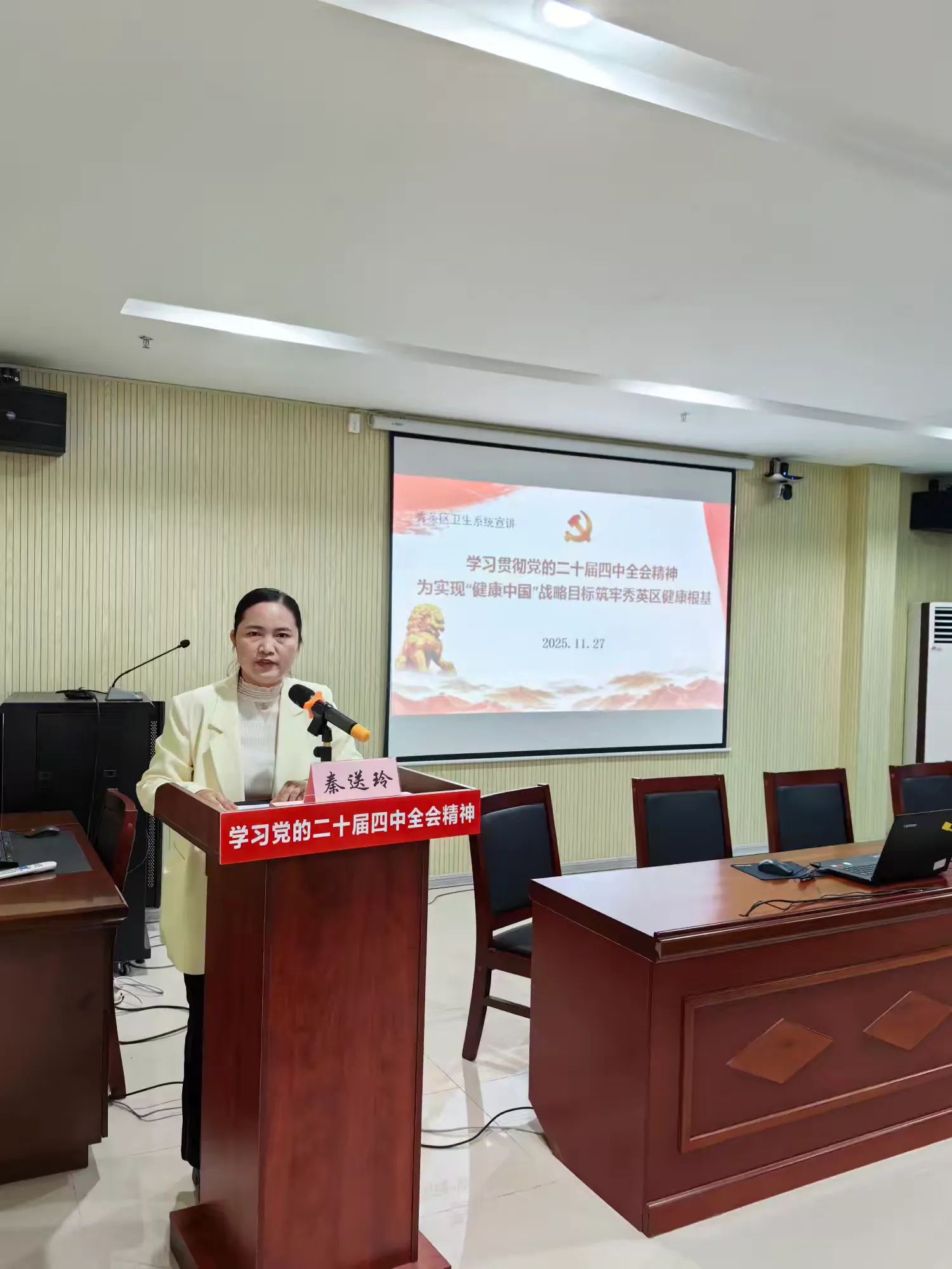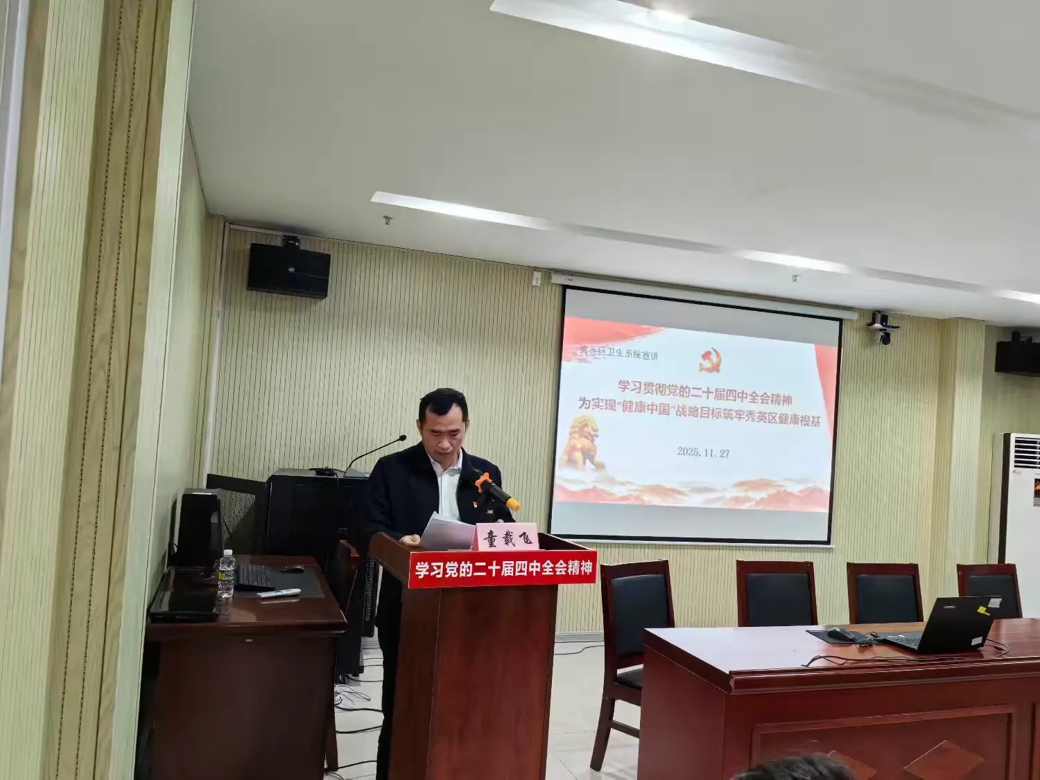 王身坚副教授以《学习贯彻党的二十届四中全会精神,为实现“健康中国”战略目标筑牢秀英区健康根基》为专题进行宣讲,围绕全会总体情况、《中共中央关于制定国民经济和社会发展第十五个五年规划的建议》核心要义、全会精神贯彻落实及践行“两个维护”的高度自觉等四个方面,深刻阐释了全会的重大政治意义和深远影响,系统回顾了“十四五”时期我国发展取得的重大成就,并从“十五五”时期发展面临的形势、重要地位、指导思想、遵循的原则、主要目标、战略任务、重大举措和根本保障等维度,对全会精神进行了系统深入的宣讲和解读,同时紧密结合海南自贸港建设和秀英区卫健工作实际,将理论与实践相结合,既有理论深度又具实操价值,让在场人员受益匪浅、深受启发。