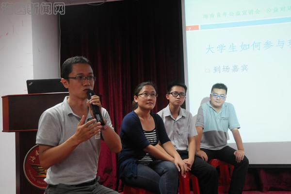 宣讲会开始,公益达人海口龙华区乐助服务社李洛萩社长为大家做“慈善与现代公益”的主题分享,洛萩姐从社工发展背景及过程向现场同学做了系统而专业的公益知识科普;紧接着,资深公益创新大咖海口星辰特殊教育中心韩苏校长就“青年参与社会创新实践”给现场学生一些启发和建议。嘉宾老师们分别从自己的角度向在场的学子们阐述了一个理念:“做公益是帮助别人,更是成就自己”。 随后,现场学生与到场嘉宾就“四大热点公益观念”进行交流探讨。最后,进入现场互动问答环节,现场学生就嘉宾分享话题感悟及讨论议题内容与嘉宾老师进行对话交流,同学们争相发言,参与非常踊跃,现场气氛非常热烈。