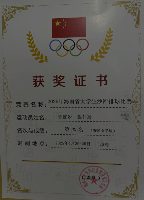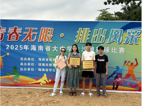 4月25日,由海南省教育厅、海南省旅游和文化广电体育厅举办的2025年海南省大中学生沙滩排球赛在琼海市海桂中学落下帷幕了。我校女子沙滩排球队凭借顽强拼搏的体育精神和默契的团队配合,姑娘们以坚韧的意志克服体能极限,每一场对决都拼尽全力,最终荣获普通女子组第七名的优异成绩。值得一提的是,我校沙滩排球女队队员为口腔医学、卫生检验与检疫专业的在读学生,她们在繁重的课业压力下,坚持利用课余时间投入训练,将医学专业所需的专注力与运动员的拼搏精神完美结合。"医学和体育都需要持之以恒的毅力。这次比赛不仅是一次竞技,更让我们学会了如何在压力下保持冷静,这对未来的临床工作同样重要。"队长鲁同学在赛后表示。