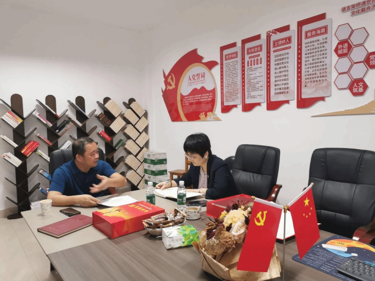 针对下一步建设,韦杰同志提出三点要求:一是要持续深化“党建 +”融合模式,推动党建与业务从“物理结合” 向“化学反应”转变,使党建引领贯穿各项工作全过程;二是要扩大党员先锋模范作用辐射面,聚焦国家级项目申报、高层次人才引进等重点领域,进一步凝聚支部合力;三是要做实服务海南自由贸易港建设的载体,完善与附属医院的共建机制,打造标准化、常态化的语言服务品牌,切实发挥样板支部的示范引领作用。