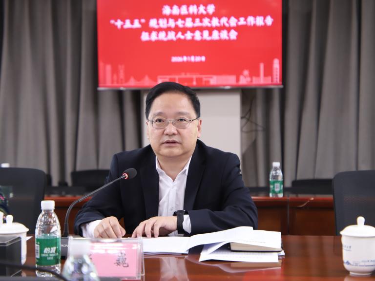 张巍首先介绍了《海南医科大学“十五五”发展规划(征求意见稿)》和《教代会工作报告(征求意见稿)》的起草背景、主要内容和重要意义。他表示,学校党委高度重视统战工作,期待各位代表充分发挥智力密集、联系广泛的优势,围绕学校未来发展积极建言献策,共同推动学校各项事业高质量发展。