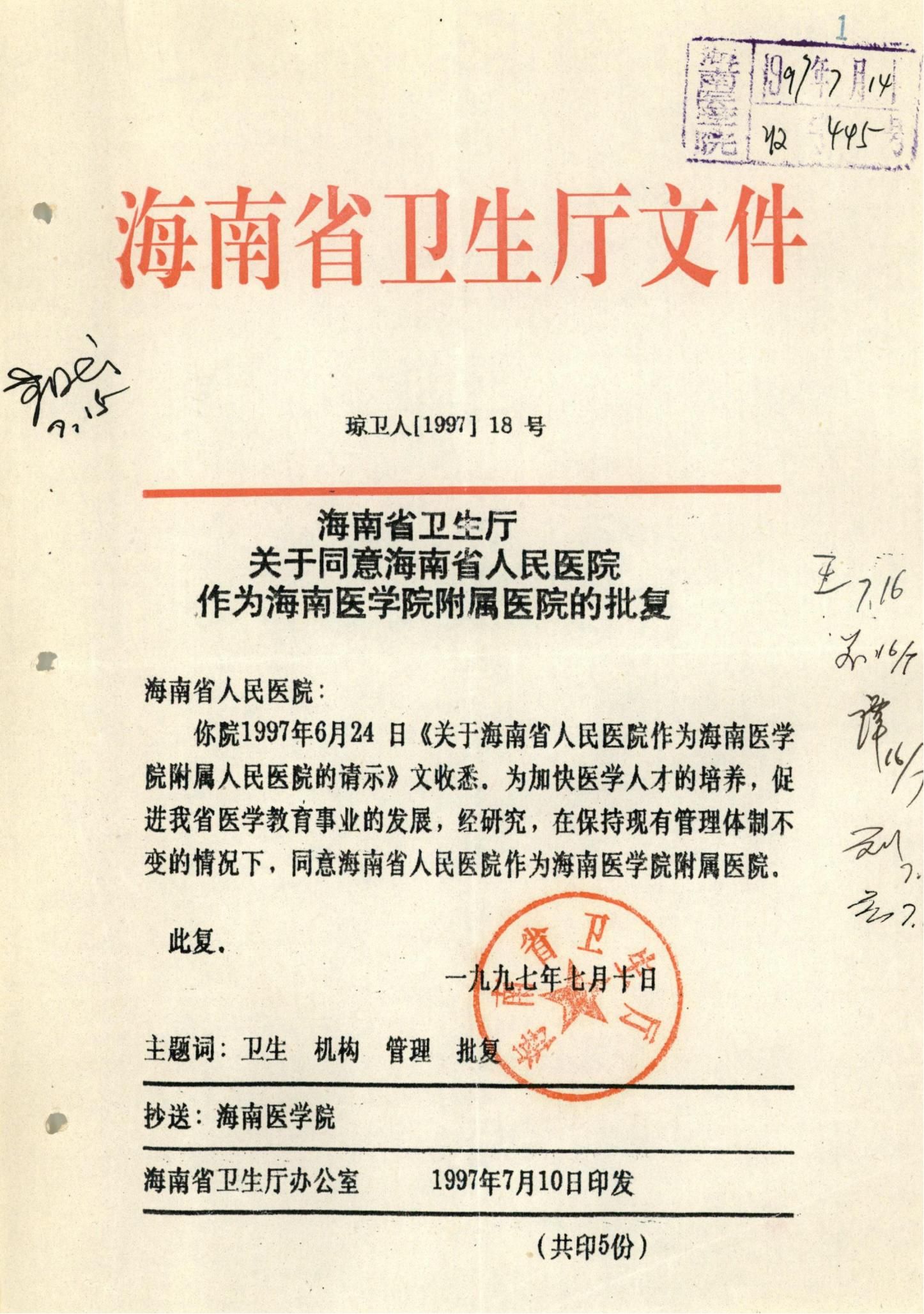 1996年、1997年,经海南省卫生厅批准,将海南省农垦总局医院和海南省人民医院分别设立为我校附属新华医院和附属人民医院。