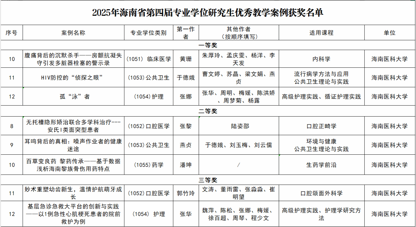 近日,海南省教育厅公布了2025年海南省第四届专业学位研究生优秀教学案例评选结果,我校荣获一等奖3项、二等奖3项、三等奖2项,涵盖临床医学、公共卫生、护理、口腔医学、药学等多个专业学位领域。