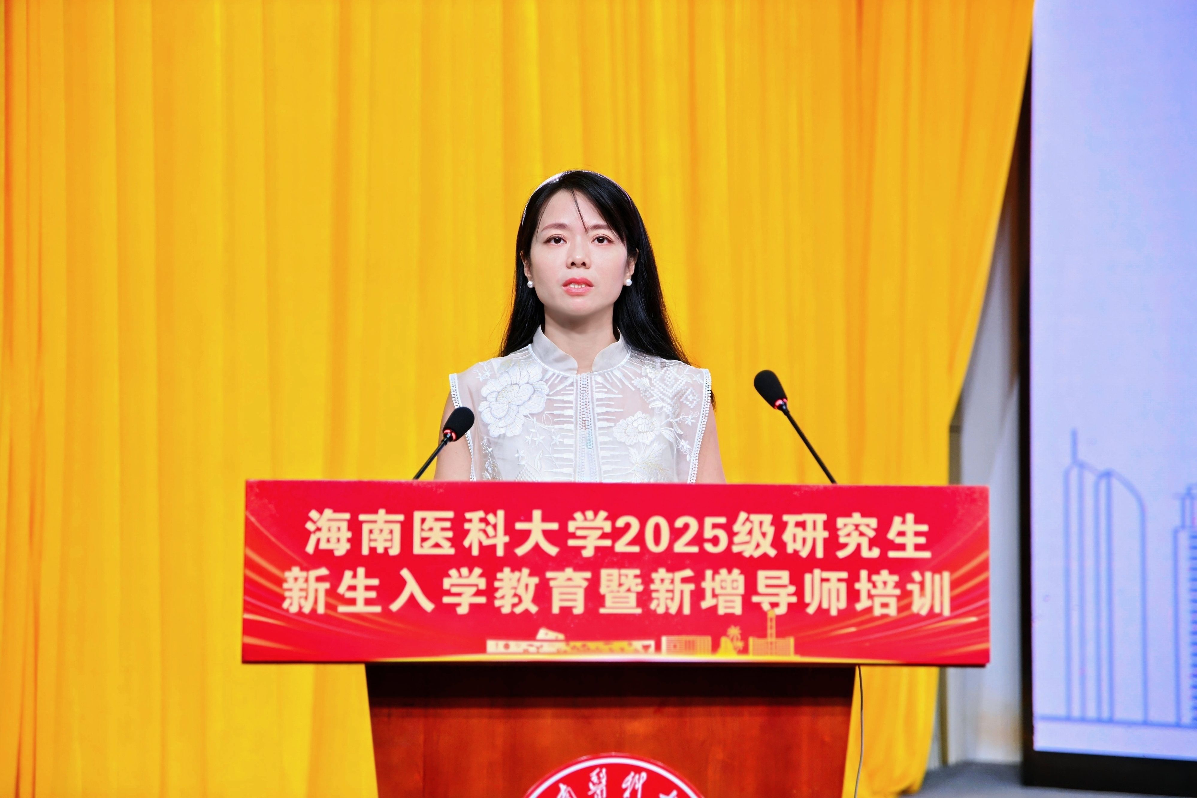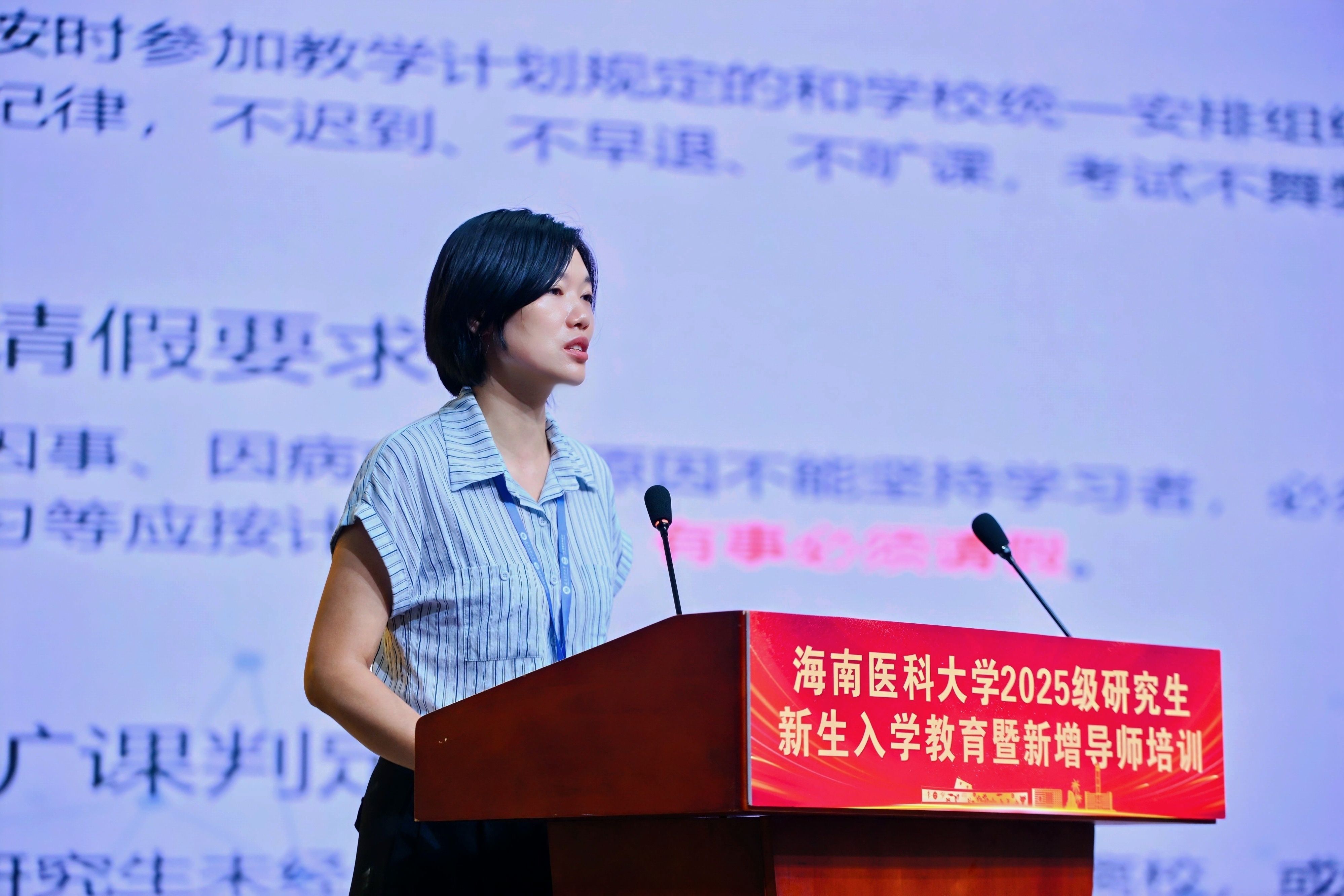 上午场:夯实学术根基,聚焦能力提升研究生院副院长孟庆雯系统解读了研究生分类分层培养体系,从开题报告撰写、中期考核标准到答辩流程细节,逐一拆解学术全周期关键节点,帮助新生建立清晰的科研路径认知。研工部负责人揭秋云则详解了研究生奖助体系与管理制度,涵盖奖学金申请条件、助学金发放标准及权益维护渠道,为新生安心求学扫清障碍。研究生会主席黄思博同学介绍了学校研究生会的基本情况,还预告了近期即将开展的“海医研途”系列活动,邀请新生积极参与,快速融入校园生活。