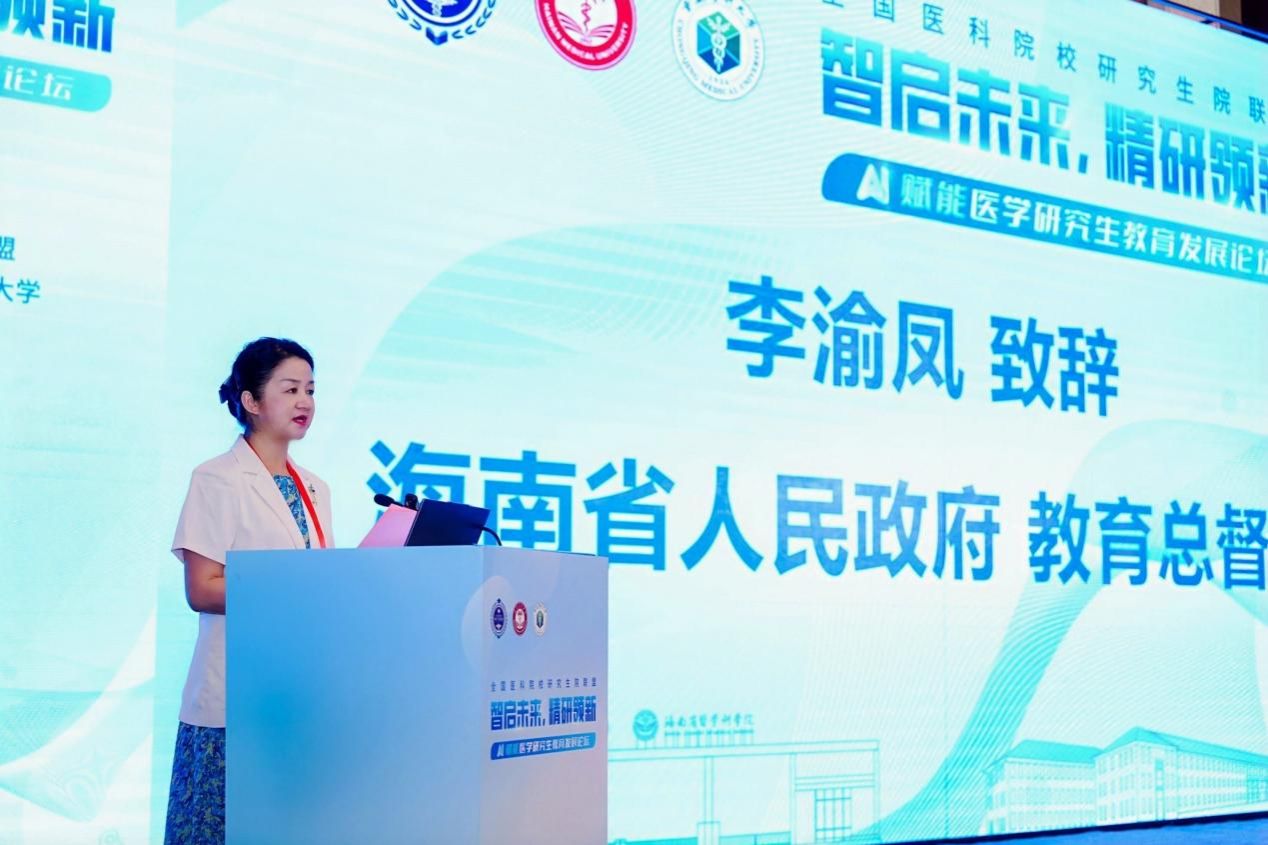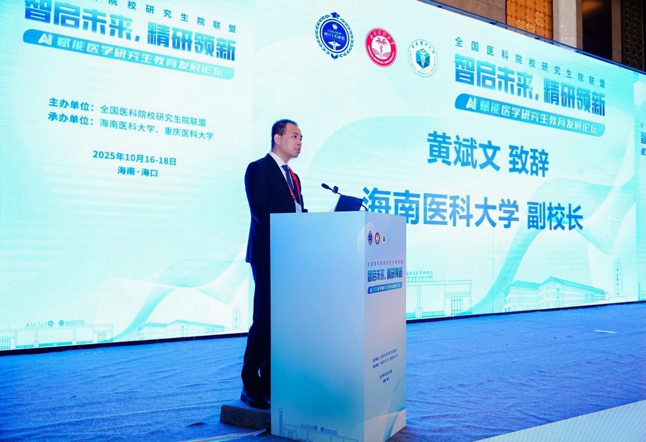 海风习习,绿树苍翠,10月17日,由全国医科院校研究生院联盟主办,海南医科大学与重庆医科大学承办的“智启未来,精研领新——全国医科院校研究生院联盟AI赋能医学研究生教育发展论坛”在海口召开,来自全国37家单位的200余名参会代表共同研讨新时代研究生教育高质量发展。教育部原副总督学刘锦作主旨报告,海南省人民政府教育总督学李渝凤、海南医科大学副校长黄斌文致辞。