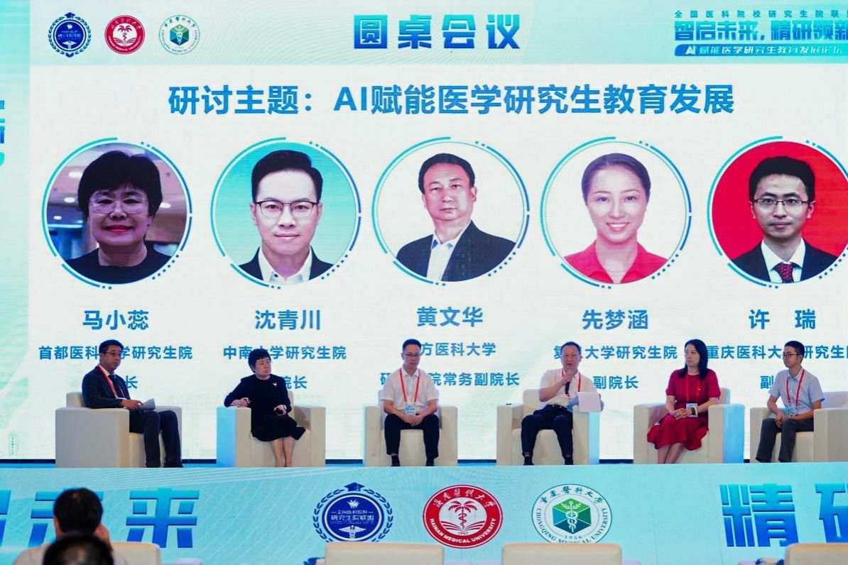 在圆桌会议环节,特邀南方医科大学研究生院常务副院长黄文华与先梦涵、许瑞、马小蕊、沈青川五位专家围绕“用好AI赋能医学研究生教育发展”“研究生教育管理者在AI转型浪潮中引领研究生教育模式转变的探索”“研究生教育的数字化实践经验分享”等主题进行深入交流研讨。