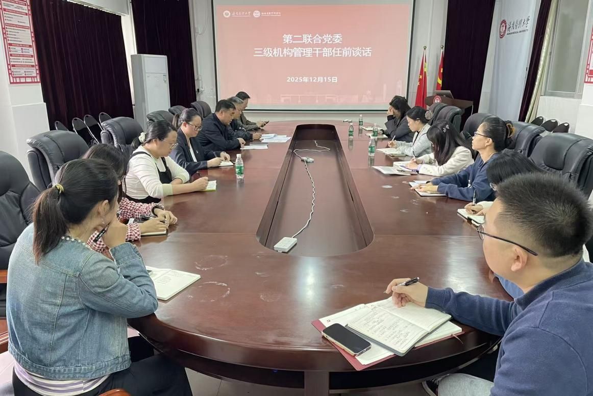 2025年12月15日,海南医科大学第二联合党委三级机构管理干部集体谈话会在润深楼402会议室召开。第二联合党委书记李春报,党委副书记、纪委书记李萌杰出席会议,新任三级机构管理干部参会,李萌杰主持会议。