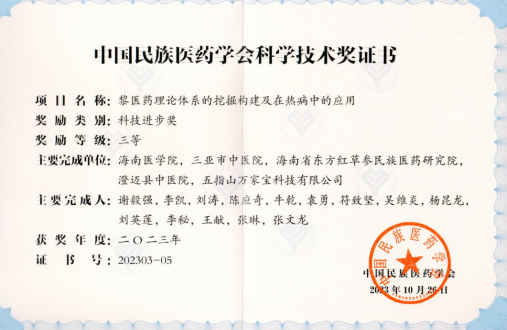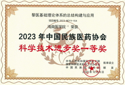 团队的研究成果《黎医基础理论体系的总结构建与应用》、《黎医药理论体系的挖掘构建及在热病中的应用》分别荣获2023年中国民族医药协会科学技术奖“一等奖”和中国民族医药学会科学技术进步奖“三等奖”。这些成果是对海南省黎医药理论传承创新工作的阶段性总结,也是团队科研实力的有力证明,为黎医药的传承和发展提供了宝贵的理论支持。