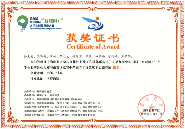 团队以科研反哺教学,设立中医学学科下黎医药特色研究方向,培养研究生10余人。通过“三下乡”等团学活动,获团中央全国大中专学生志愿者暑期文化科技卫生“三下乡”社会实践活动“优秀团队”1次,团省委“优秀团队”2次。为激发学生探索黎医药的热情,多次组织学生参与并完成国家级大创和省级大创各1项,获第九届中国国际”互联网+“大学生创新创业大赛海南赛区“银奖”(省级)和校级二等奖、三等奖;第二届全国中医经典传承大赛“一等奖”2项。