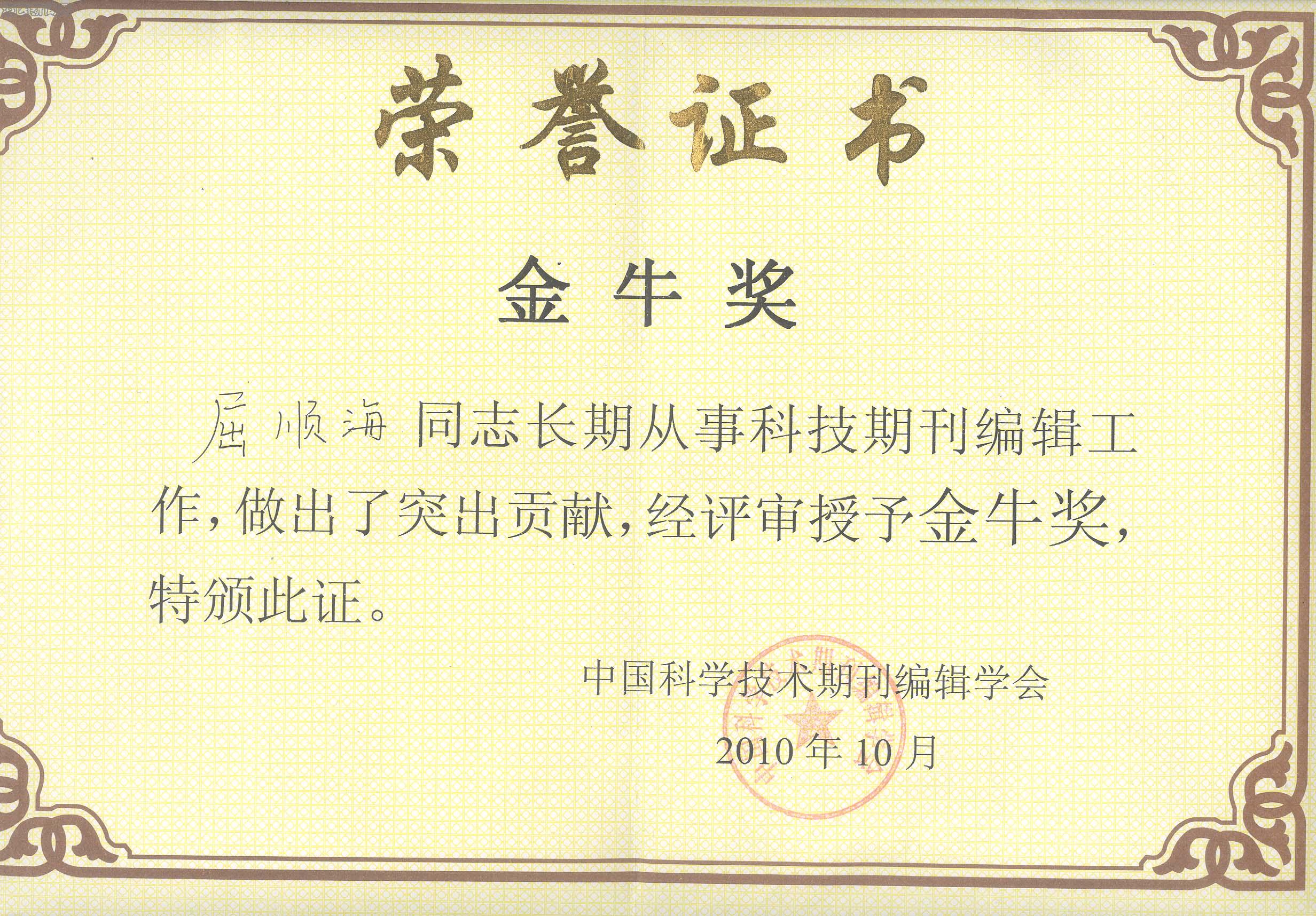 屈顺海社长获得 “金牛奖”荣誉称号。据悉,全国有期刊上万种,获“金牛奖”奖项仅有64人。