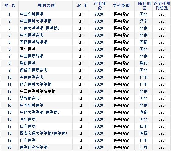表1 2020年被评为权威学术期刊(A+等级)和核心学术期刊(A等级)的医学类期刊排行榜