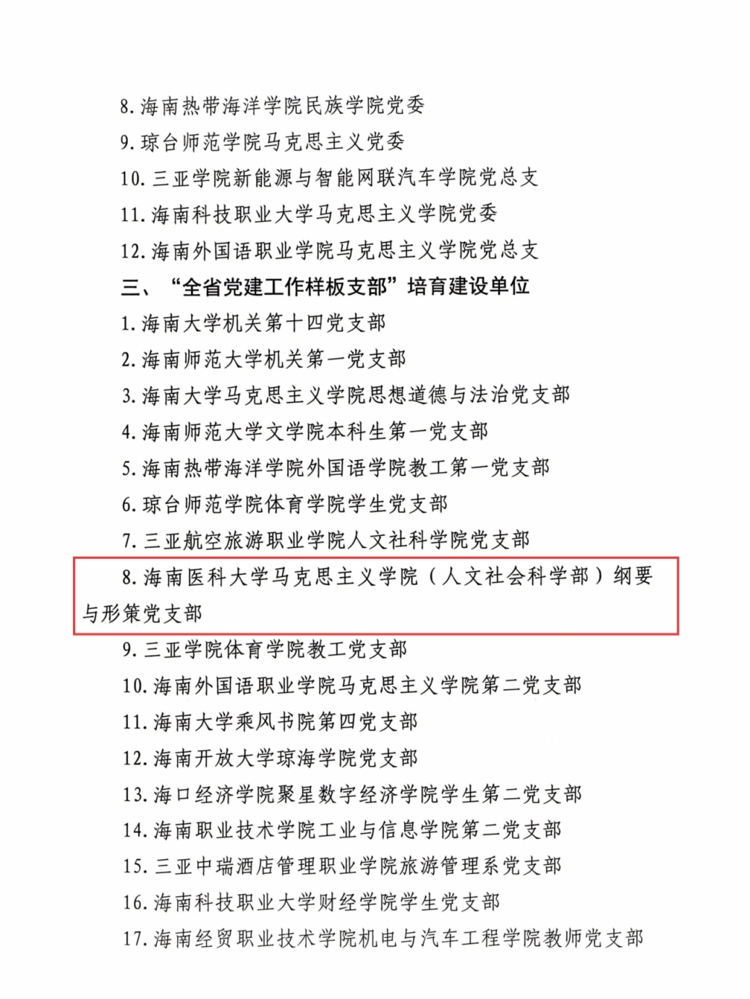 近日,中共海南省委教育工作委员会公布全省第四批新时代高校党建示范创建和高校“双带头人”教师党支部书记工作室培育建设名单。我校党委入选“全省党建工作示范高校”培育建设单位。