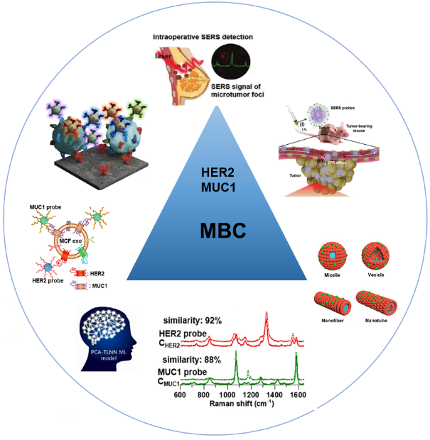 SERS技术由于其高灵敏度和高时空分辨,在乳腺癌转移检测和治疗评估中展现了巨大的潜力。SERS技术可通过液体活检,高灵敏检测CTCs、EXOs等转移性标志物,提供无创且高效的转移监测手段。同时,SERS成像技术能够精准定位微小的转移病灶,改善乳腺癌的早期诊断和手术定位。在乳腺癌组织病理学活检中,SERS技术通过直接分析组织中的分子信息,提供比传统组织学方法更为迅速和准确的诊断结果,避免了染色和免疫组化过程中的人为误差。这些优势使SERS技术在乳腺癌转移检测及个性化治疗评估中具有重要应用前景。
