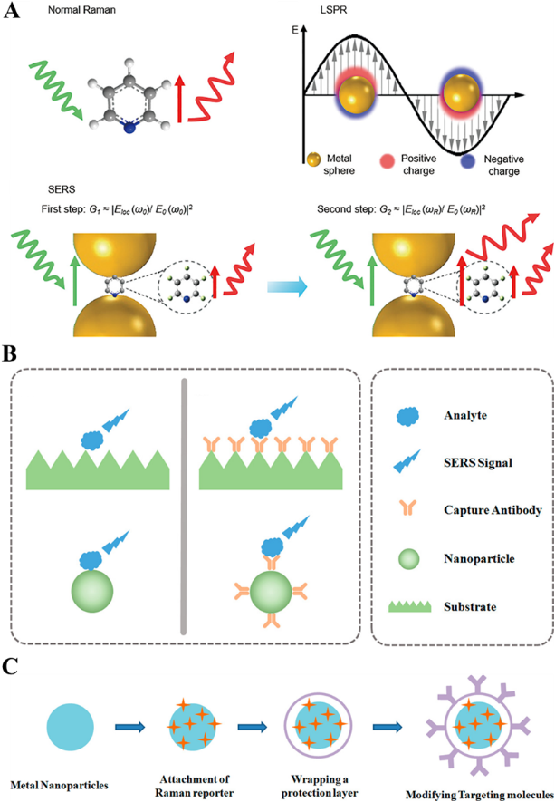 拉曼散射(Raman scattering,RS)是一种基于分子振动特征的光谱分析技术。其原理是入射光与分子相互作用后,光子的能量发生微小变化,导致散射光的频率偏移,这一频移与分子振动模式相关。因此,拉曼光谱能够提供分子结构的指纹信息,广泛应用于化学、生物和材料科学等领域。然而,普通拉曼散射的散射截面极小,仅约为入射光的10-6~10-8,导致其信号极其微弱。此外,背景荧光干扰和低检测灵敏度限制了拉曼技术在痕量分析中的应用。1974年,Fleischmann等在粗糙的银电极表面观察到异常增强的吡啶分子信号,1977年Van Duyne和Jeanmaire等揭示其核心机理源于贵金属纳米结构的局域电磁场增强,并正式提出表面增强拉曼(Surface-enhanced Raman scattering,SERS)概念。随着激光技术和纳米材料与技术的发展,逐步明确了电磁场增强与化学增强的协同机制,并优化金、银等基底材料,奠定了单分子检测的理论基础。21世纪以来,纳米技术的突破推动了SERS的快速发展。通过精密调控纳米结构(如核壳、纳米间隙阵列)产生“热点”,灵敏度显著提升,应用扩展至生物医学、环境监测和公共安全。当前研究聚焦非贵金属基底、智能响应材料及单分子检测优化,同时探索与微流控、机器学习的多模态集成。未来,SERS有望在精准医疗、实时环境监测等领域实现更广泛的实际应用,其理论完善与技术创新将持续驱动分析科学的进步。纳米材料的引入是SERS技术发展的关键。纳米材料,尤其是贵金属纳米结构(如银和金)以及二维纳米材料(如石墨烯),在多种疾病诊断中展现出巨大的潜力。如图1所示,基于SERS的疾病检测方法备受关注。拉曼信号可以在纳米材料的作用下增强几个数量级(通常是103~108倍)。当分子吸附到特定结构表面(如贵金属纳米结构)时,拉曼信号会通过两种机制显著增强,电磁场增强和化学增强 。电磁场增强通常发生在贵金属纳米结构表面,源于局部表面等离子体共振(Localized surface plasmon resonance, LSPR)的激发(图1A)。当入射光与金属纳米颗粒相互作用时,其表面的自由电子发生集体振荡,从而在纳米结构附近产生强电磁场。这种局部电磁场的增强效应能够显著提高拉曼信号的强度。LSPR现象可被从紫外至可见光波段的电磁波激发,是贵金属纳米结构SERS增强的关键机制。然而,这种增强机制不适用于大多数半导体纳米材料,因为它们通常不具备产生LSPR所需的自由电子密度。化学增强机制是半导体纳米材料中SERS信号增强的主要来源(图1B)。该机制依赖于分子与基底之间的电子耦合,具体受材料的能级结构和电子态密度的影响,包括带隙能量、最高占据分子轨道和最低未占据分子轨道的位置。当分子吸附在半导体表面时,可能发生电荷转移过程,从而增强拉曼散射信号。尽管化学增强的效应通常较电磁增强弱几个数量级,但其选择性更高,适用于某些无法通过LSPR增强的分子系统。光催化剂的激发指的是光催化剂吸收能量大于或等于其禁带宽度的光子能量后,内部电子被激发至高能级状态的过程,是光催化反应中的关键步骤。被激发的电子从价带跃迁到导带,在价带上会留下相对稳定的空穴,形成电子-空穴对。激发态的电子和空穴需要分离并传输到光催化剂的表面或活性位点,以便与反应物发生氧化还原反应。导带上处于激发态的电子具有较高的能量和移动性,可以参与还原反应;价带上的空穴带正电,可以参与氧化反应。光照强度和波长、催化剂的能带结构、催化剂的表面结构和形貌、催化剂的掺杂或修饰以及反应环境是影响光催化过程中催化剂效率和活性的主要因素。通常情况下:光照强度越高、波长与催化剂吸收波长匹配度越好,催化剂吸收光子的概率就越大,则电子-空穴对的激发效率越高;催化剂的能带结构决定了其能否有效地吸收和利用光子;表面结构和形貌会影响光子的吸收强度、电子-空穴对的分离效率以及活性位点的暴露程度;通过掺杂或表面修饰,可以调节催化剂的电子结构、能带位置和光吸收特性,从而改善其光催化性能;反应体系的温度、pH值、反应物浓度和溶液中的氧含量等因素会影响催化剂表面的电荷转移过程和催化活性,进而影响光催化反应的进行。