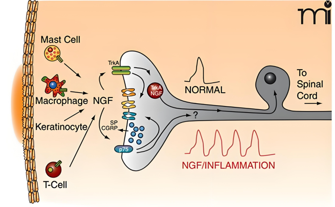 银屑病是一种以表皮过度增生及炎性细胞浸润为特征的炎性皮肤病。神经系统通过神经递质对免疫细胞的影响对银屑病的发生、发展起重要作用,焦虑或抑郁往往会引起银屑病的发生或加重,银屑病患者对焦虑或抑郁比正常人更为敏感。在银屑病皮损的真皮乳头层的神经纤维大量增生远远多于正常皮肤,如果切断银屑病皮损局部的神经纤维或进行局部麻醉,银屑病皮损会消退,银屑病可能是一种神经免疫性疾病。NGF可通过神经肽在银屑病皮损中发挥作用。银屑病皮损中存在超出正常水平的P物质、血管活性肠多肽(VIP)等物质,同时伴有神经肽免疫反应,这些神经肽能诱导角质形成细胞和内皮细胞增殖,促进中性粒细胞趋化和肥大细胞脱颗粒,其中P物质还能诱导黏附分子表达及活化T细胞和IL-8的产生。NGF除直接诱导角质形成细胞增殖外,本身还具有免疫活性,能激活肥大细胞并使其脱颗粒显著诱导角质形成细胞(KC)表达一种强效趋化因子,并通过它促进对T细胞的趋化,同时活化T细胞,引起炎症反应。