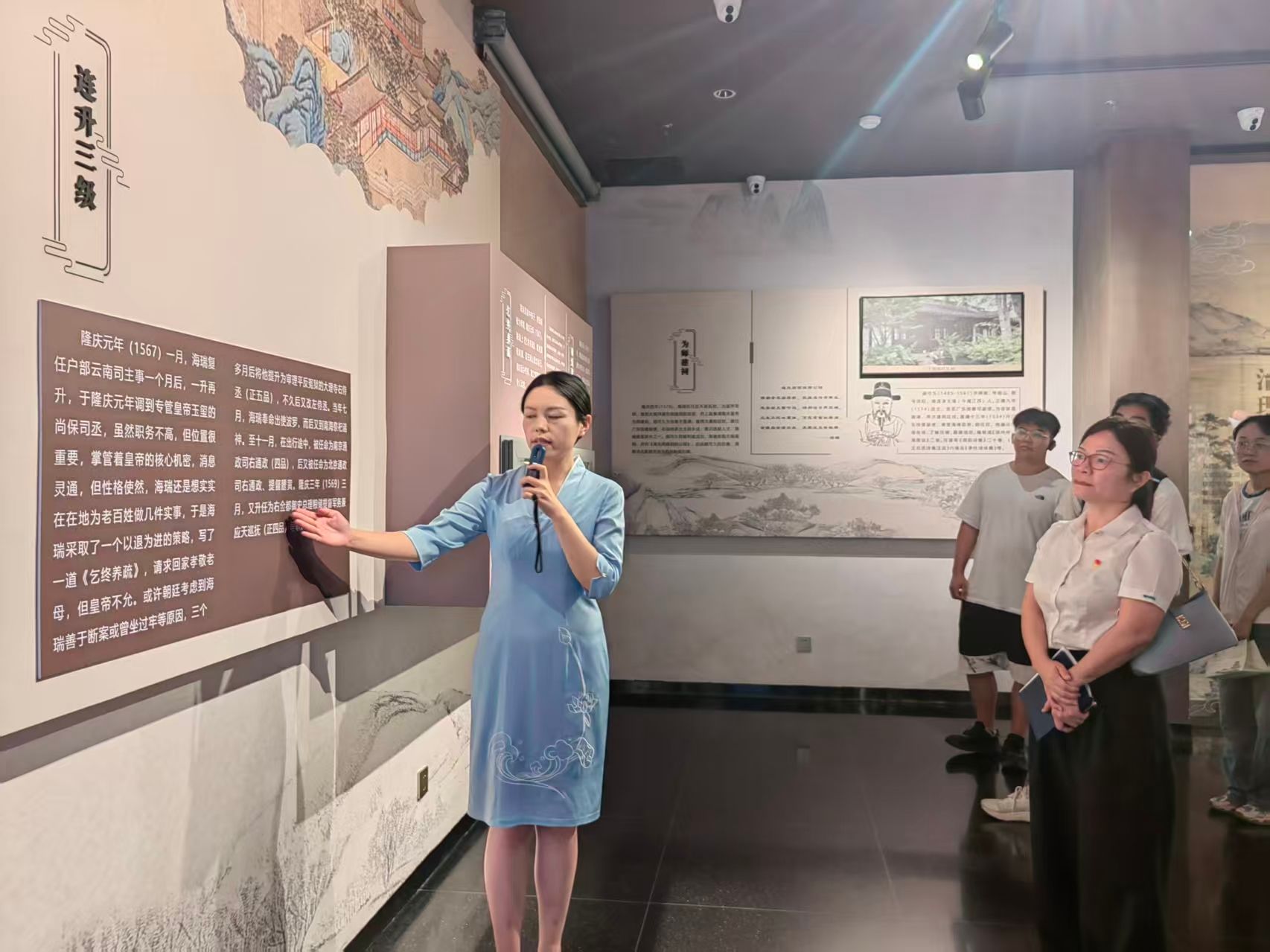 由展览馆内的图文资料记载得知,海瑞始任南平教谕,清廉刚正、从严治学;出任淳安知县时拒收贿赂、兴利除弊;担任应天巡抚时惩治豪强、体恤民情;执法公正、明察秋毫,屡破疑案、平反冤狱……一件件鲜活事例,生动诠释了“公生明,廉生威”的为政准则。历史文物与场景复原,让大家进一步了解到海瑞“直言敢谏、两袖清风”的一生。