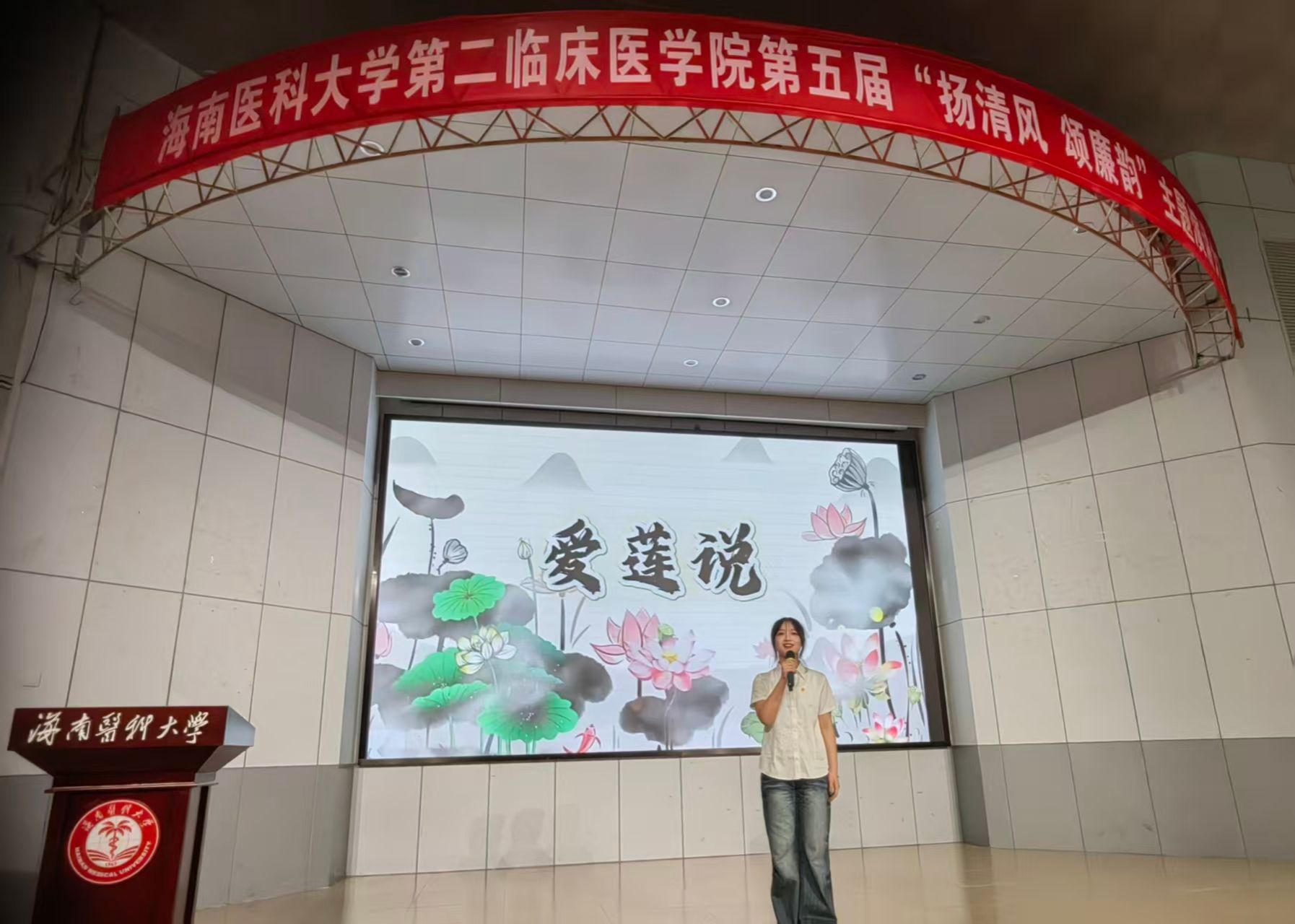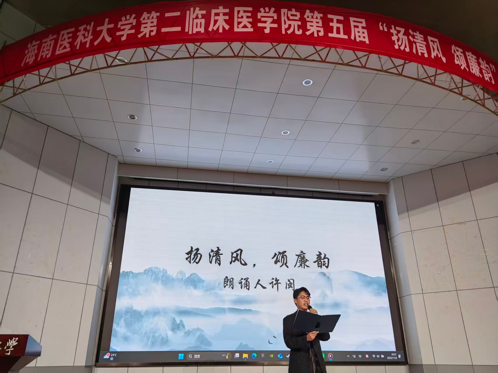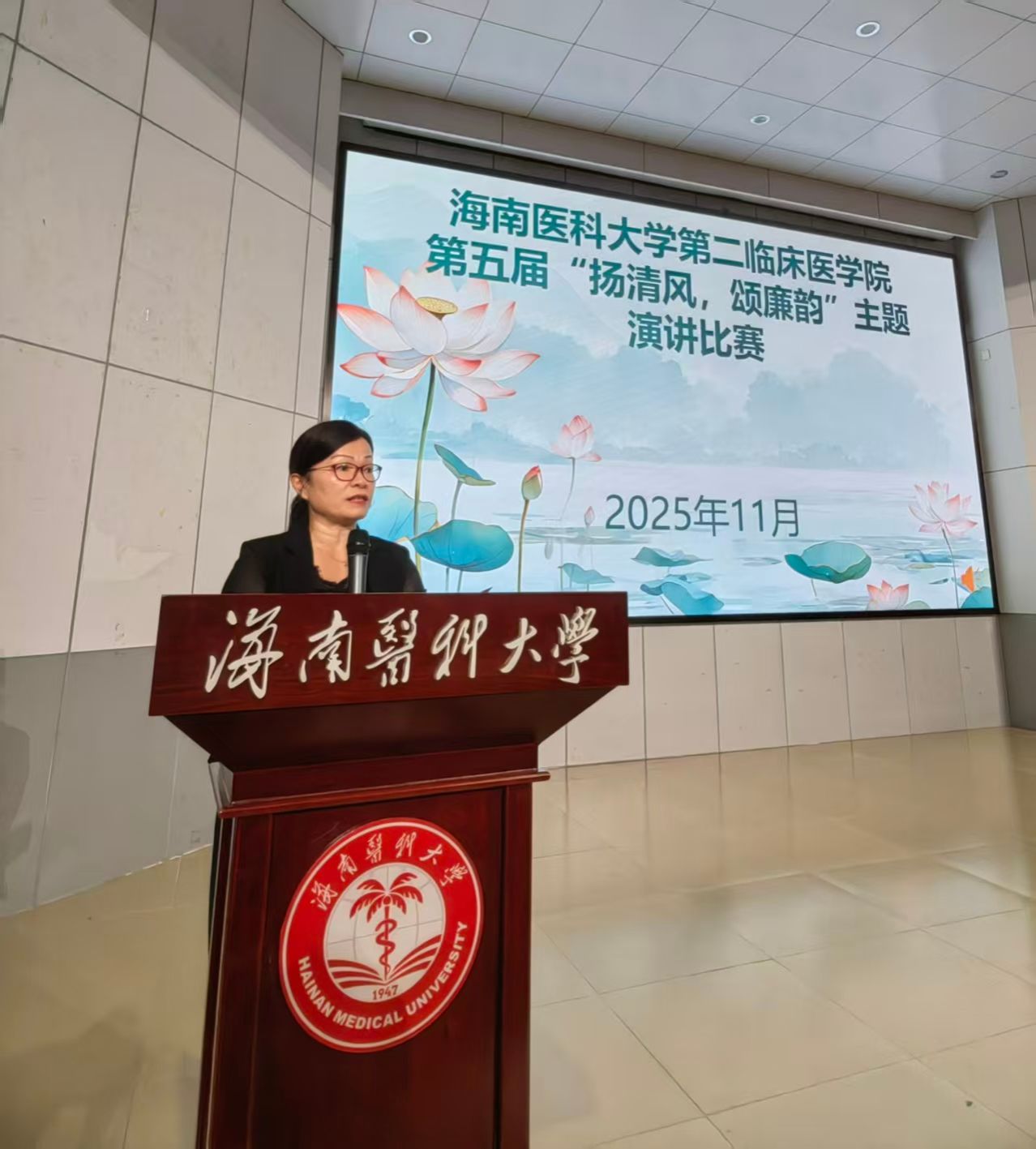 2025年11月6日晚,海南医科大学第二临床医学院第五届“扬清风 颂廉韵”主题演讲大赛在多功能报告厅落下帷幕。我院党委副书记庞小曼出席并致辞,学指委就业科邹琦老师、第一临床医学院袁铁超老师应邀担任评委嘉宾,我院辅导员刘辉老师、毛明明老师及200余名同学现场观看比赛。