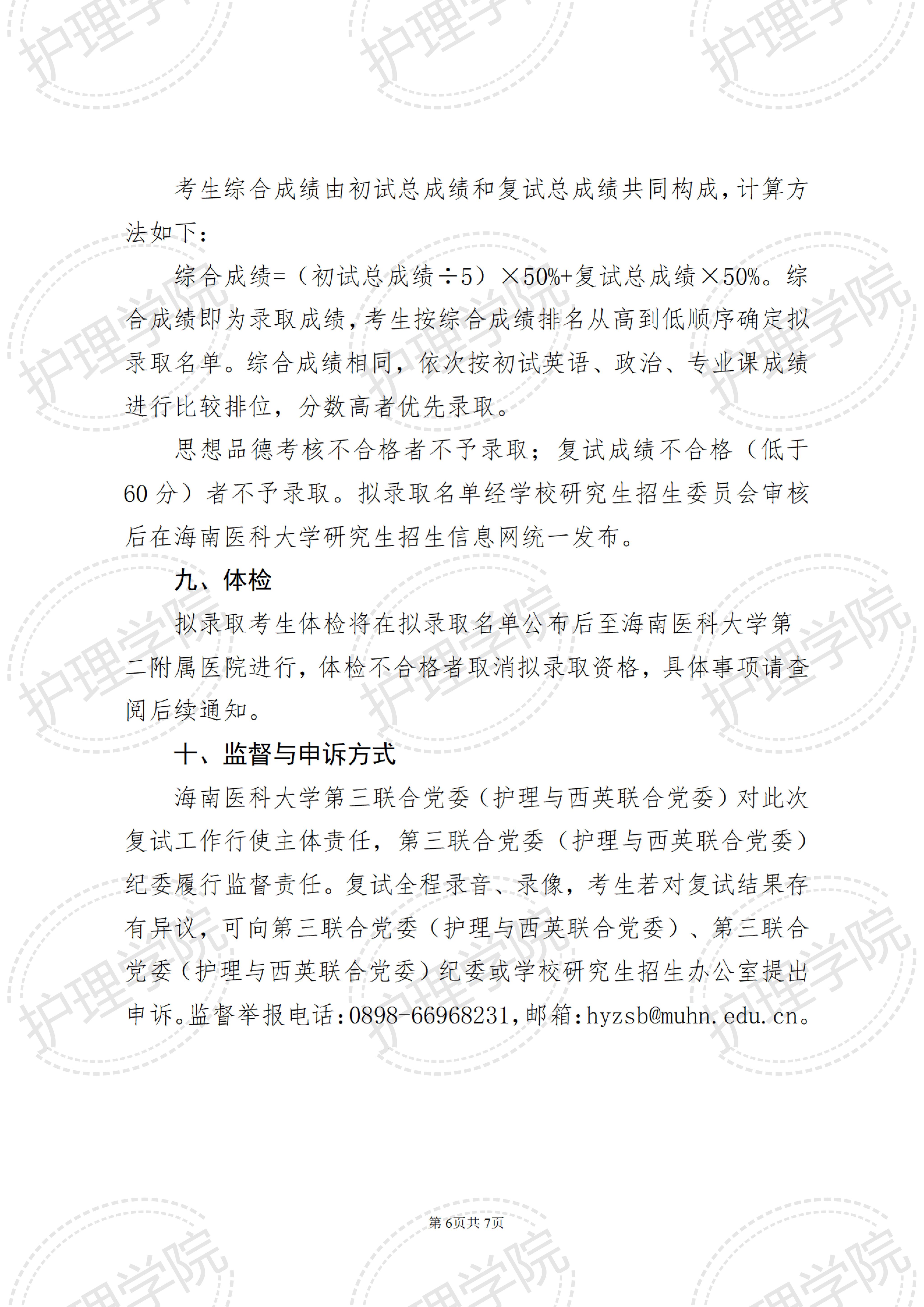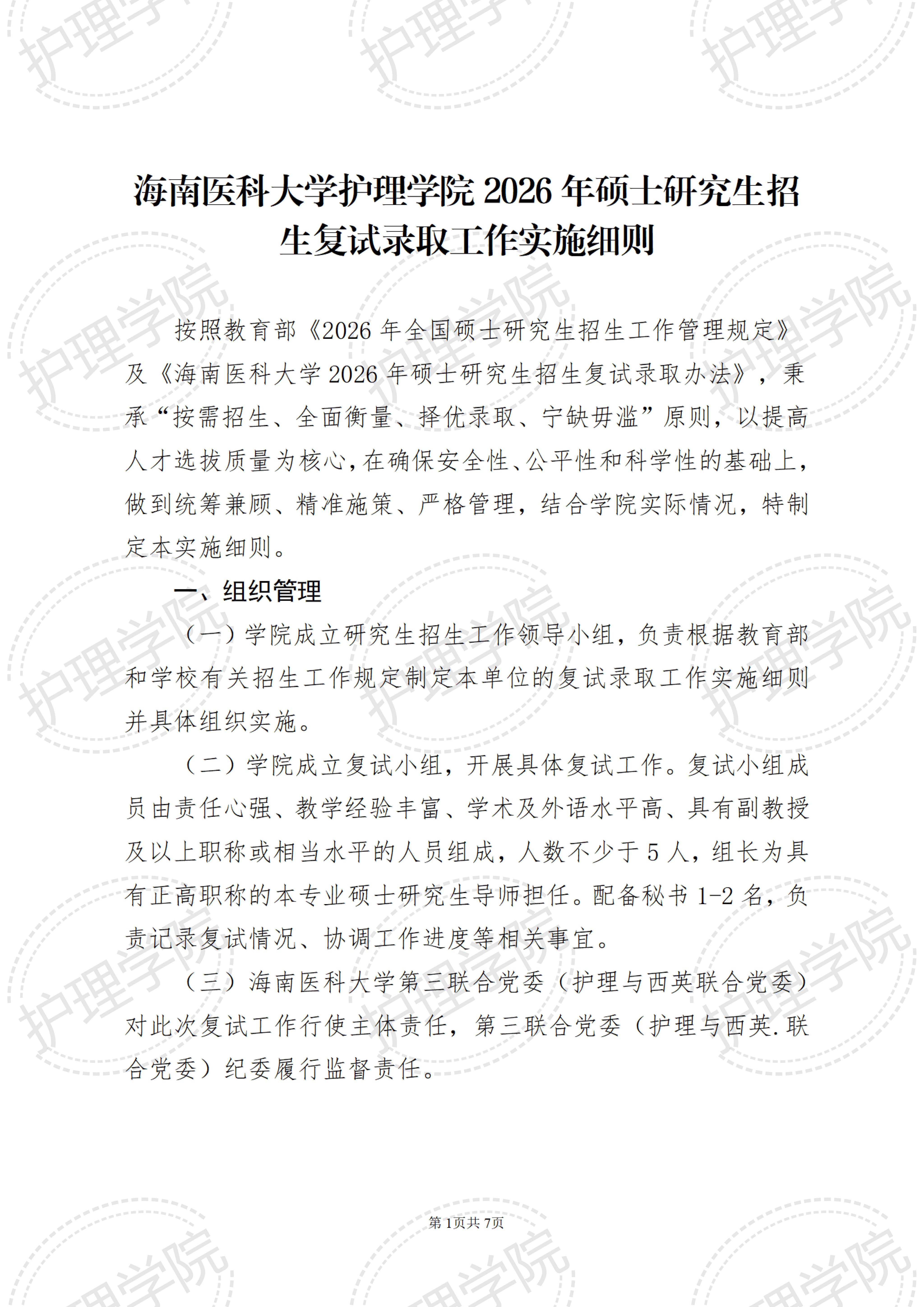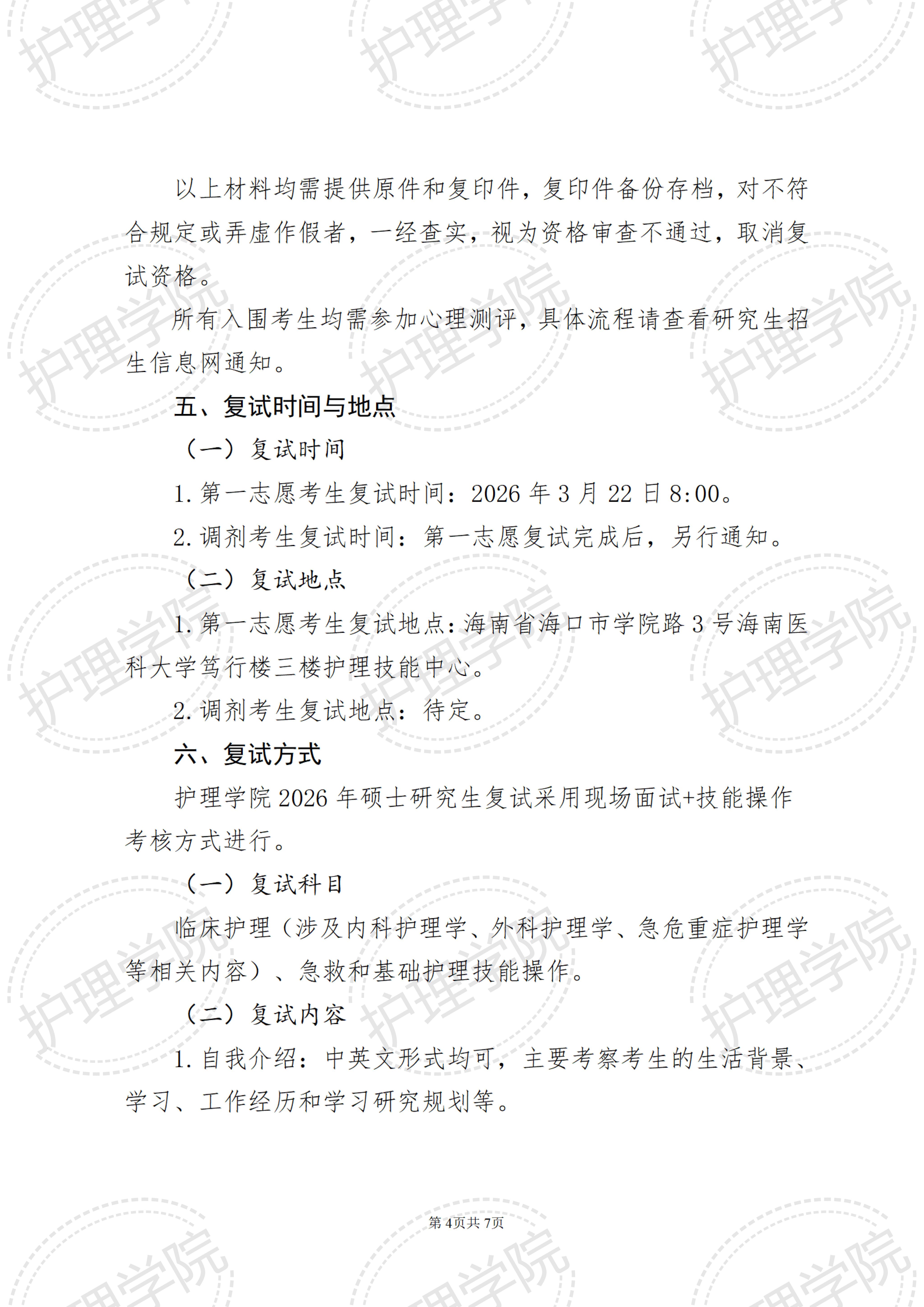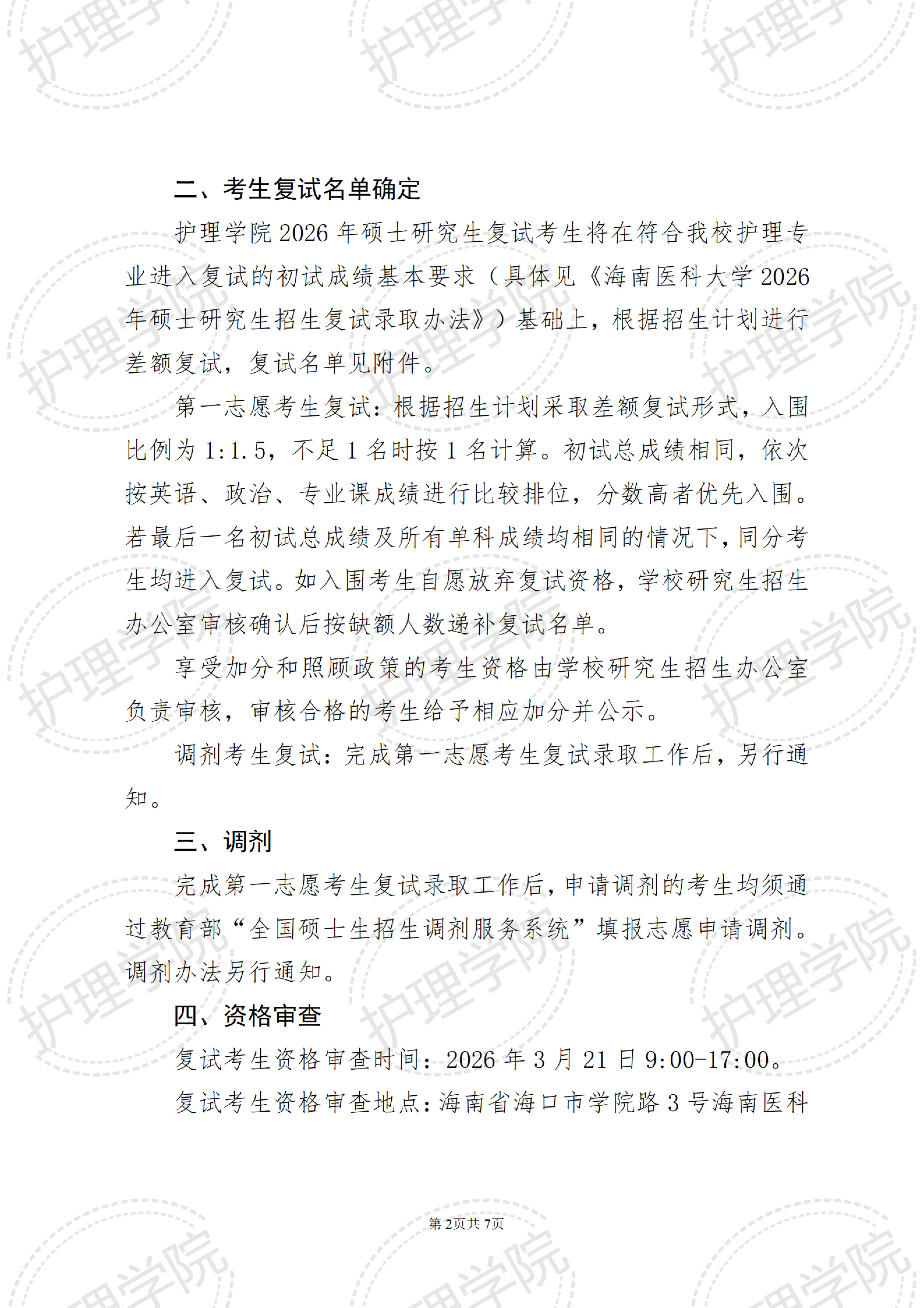 海南医科大学护理学院2026年硕士研究生招生复试录取工作实施细则