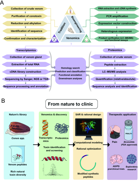 (3)聚焦方法学更新与“发现革命”。鉴于芋螺毒素数量巨大且翻译后修饰复杂,仅依靠传统纯化鉴定难以实现规模化发现,本文将当前研究路径归纳为三大框架:其一是“毒液分离纯化—活性筛选—结构鉴定”的传统策略;其二是“基因克隆/重组表达—折叠与验证”的生物工程策略;其三是以转录组、蛋白组、肽组与生物信息学挖掘为核心、并结合快速功能验证的毒素组学策略。文章进一步指出,随着序列获取速度的提升,未来瓶颈将越来越集中在“从序列到功能”的功能去孤儿化(deorphanization)以及候选分子的可开发性评估与优化上。