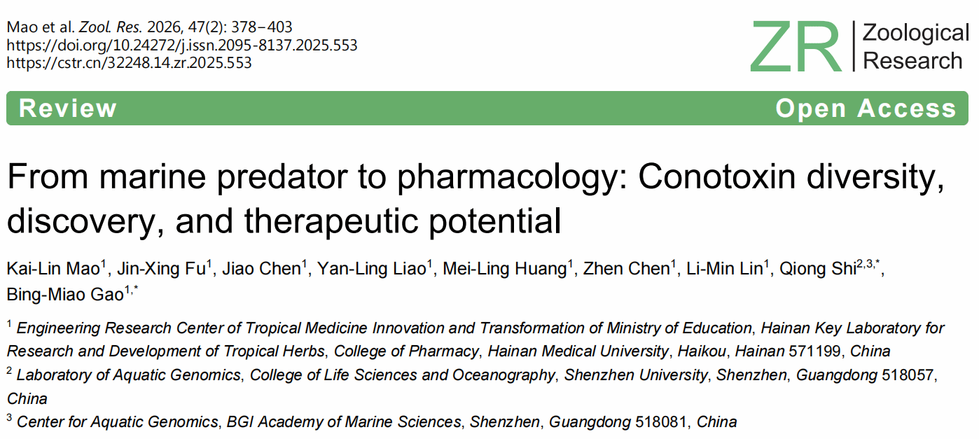 近日,海南医科大学高炳淼教授课题组与深圳大学及华大海洋(研究院)石琼院长课题组合作在国际权威期刊《Zoological Research》发表综述论文From marine predator to pharmacology: Conotoxin diversity, discovery, and therapeutic potential,系统梳理了芋螺毒素(Conotoxins)的多样性来源、发现技术路线、关键药理靶点及其治疗转化潜力,为海洋天然产物与肽类药物研发领域提供了重要的综合性参考。