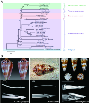 (1)从生态出发理解毒素多样性与捕食策略的耦合关系。芋螺按食性大致可分为食鱼、食蠕虫和食软体动物三类;食性与捕食策略的改变,往往伴随不同“药理模块”的扩张,例如食鱼类芋螺通常富集快速起效、靶向离子通道的毒肽,以实现对快速猎物的即时制动。文章也结合系统发育关系与齿舌针形态差异的展示,帮助读者更直观地理解“形态—功能—毒素”之间的关联。