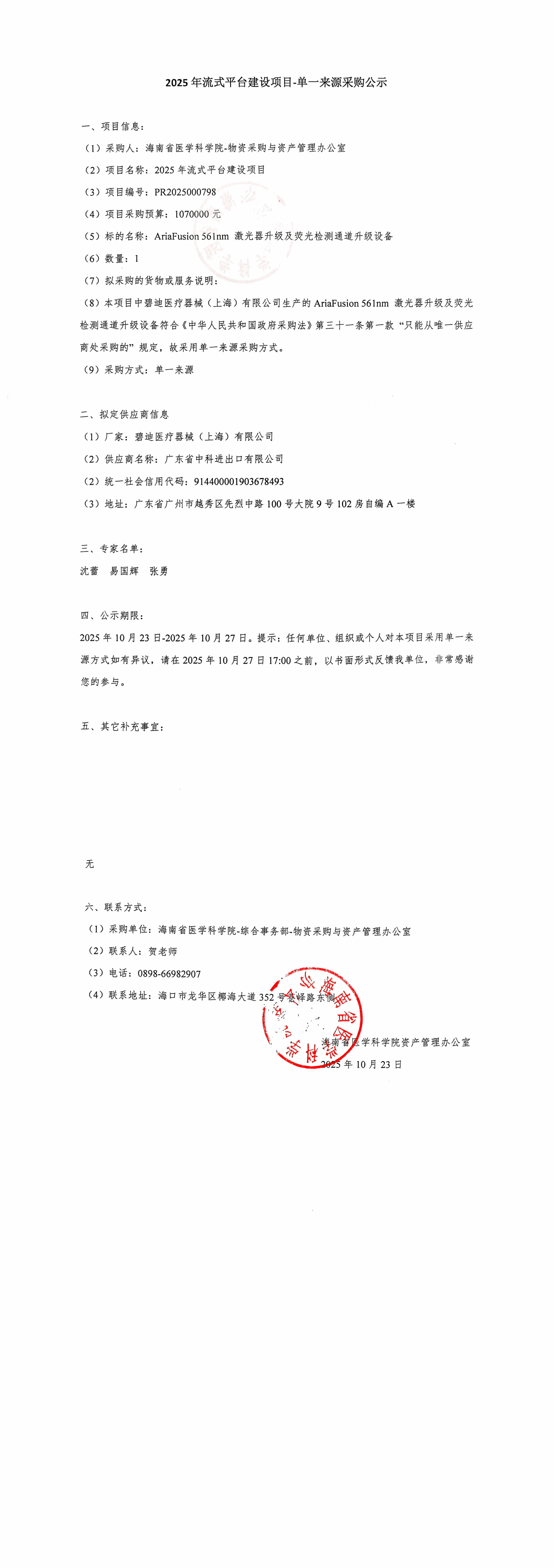 2025年10月23日-2025年10月27日。提示:任何单位、组织或个人对本项目采用单一来源方式如有异议,请在2025年10月27日17:00之前,以书面形式反馈我单位,非常感谢您的参与。