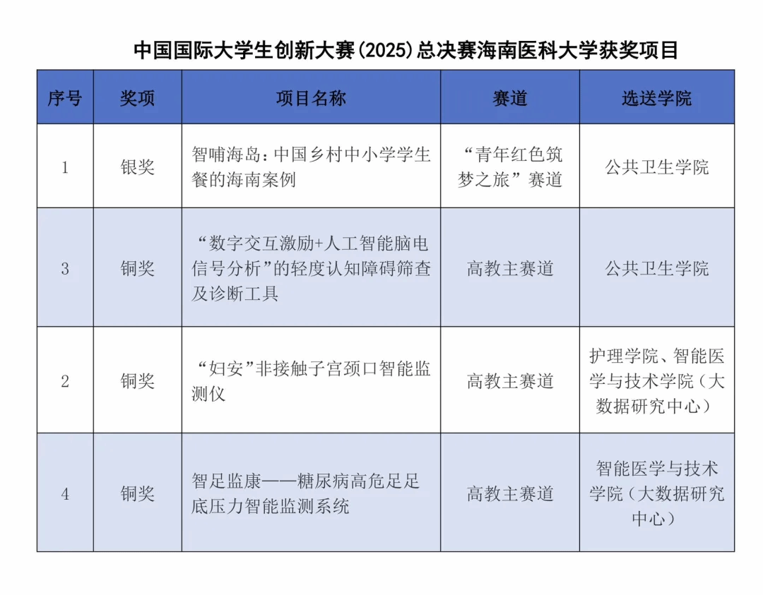 10月13至15日,中国国际大学生创新大赛(2025)全国总决赛在郑州大学隆重举行。海南医科大学参赛团队共斩获1项银奖、3项铜奖,实现了国家级奖项数量与质量的双突破。此外,学校在海南赛区还荣获省级2项金奖、2项银奖、4项铜奖,充分展现了海医学子的卓越风采。