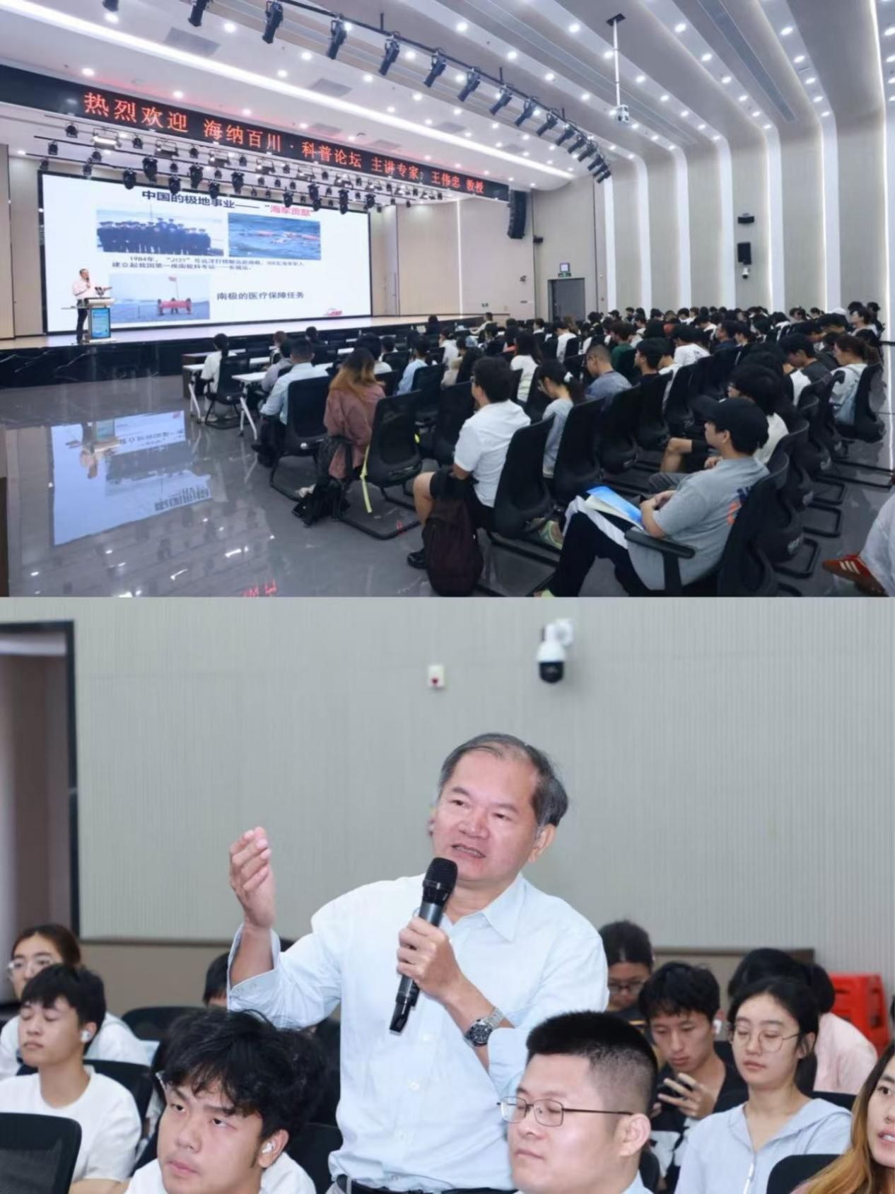 11月12日上午,我校在筱海国际教育大楼立言厅举办“海纳百川”科普论坛。中国人民解放军海军军医大学王伟忠教授应邀来校,作题为《中国极地科考与极地医学》的科普讲座。本次活动由科学技术发展研究院院长郭峻莉出席并主持,副院长李凯参会,吸引全校近300名师生现场聆听。
