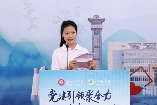 开幕式上,学子们以声传情,铿锵有力地诵读《大医精诚》,诠释医者仁心的深厚内涵。中医学院25级学生代表张明雅结合自身学习感悟,抒发对中医药事业的赤诚热爱与传承国粹的青春誓言,展现出海医中医学子朝气蓬勃、笃行致远的精神风貌。随后,全场师生庄严宣誓,以铮铮誓言许下精研医术、济世救人、不负苍生的庄严承诺,彰显新时代中医人的初心与担当。
