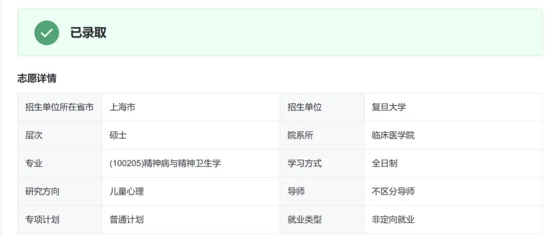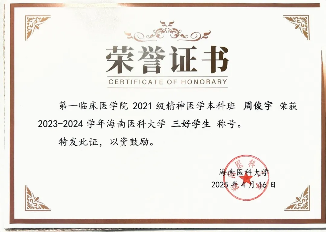 从选题构思、数据分析到论文成稿与投稿,这段完整的科研训练,让他从“学习科研”迈向“独立开展科研”的关键一步,也进一步坚定了他继续探索精神医学领域的决心。基于扎实的科研积累与综合表现,周俊宇获得推免资格,并将于复旦大学上海医学院精神病与精神卫生学专业继续深造,在更广阔的学术平台上延续他的科研探索。
