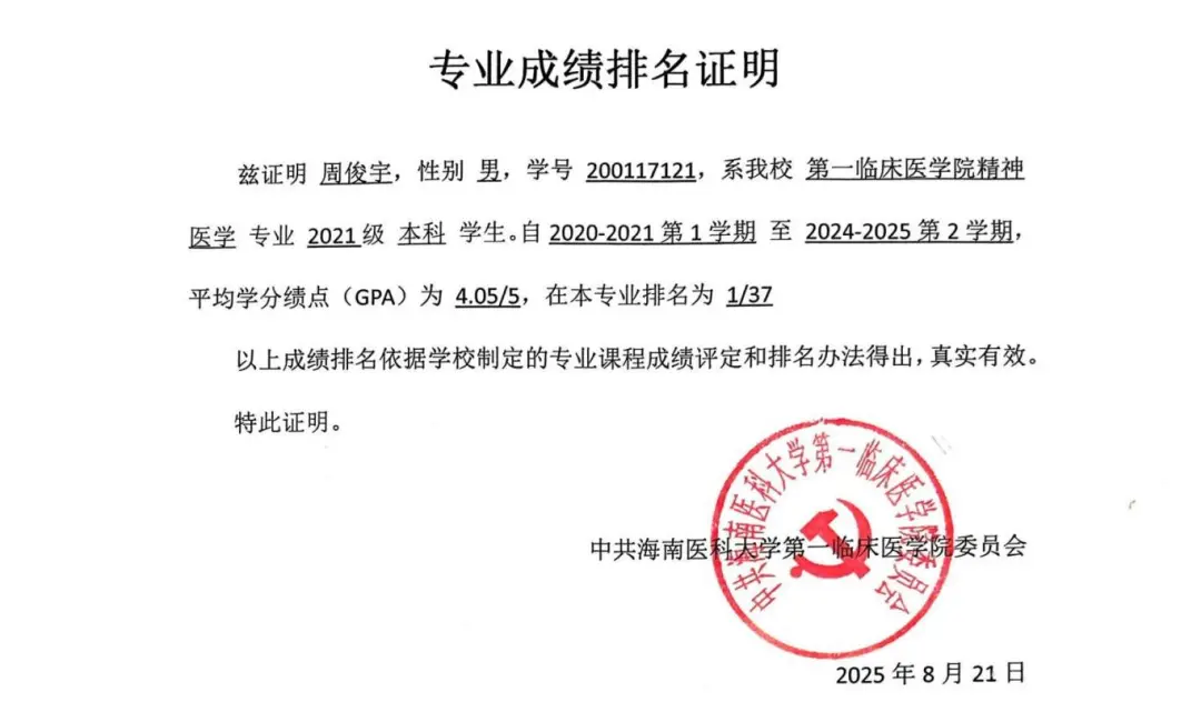 这份坚持,最终沉淀为一份扎实的成绩单:连续四学年绩点稳居专业第一(GPA 4.05/5.0,1/37),并在2021级临床医学西医类专业基础综合测评中,以平均学分绩点位列全校临床西医类第一(1/713)。