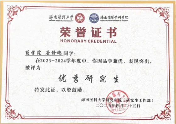 如今,她的研究聚焦于利用细胞外囊泡载药制剂,并重点研制微流控芯片设备,结合荧光检测等光学手段建立体外精准分析方法,进行药物筛选及其抗肿瘤效果研究。同时,她正探索基于功能纳米材料和微流控技术的液体活检新方法,并用于肿瘤的早期精准诊断。科研路上,她已独立主持省级创新课题1项,作为骨干参与导师的国家级、省部级项目多项,累计发表SCI论文3篇,申请国家发明专利1项,并荣获“优秀研究生”称号。各类学术会议上的报告与奖项,记录着她从聆听者到交流者的成长轨迹。