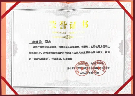 穿越风雨,终见成长。如今的唐静施,在面对知名院校的同学时,多了一份从容与自信。她敢于在会议上主动分享自己的见解,与来自顶尖院校的学子分享自己的科研思路和研究成果。这份转变,不仅是自信心的提升,更是对她科研能力的认可,是她在科研道路上不断成长的最好证明。当获得强国奖学金时,她第一时间与导师分享喜悦。那一刻,她真切体会到,所有通宵达旦的付出、霜晨雨夜的坚持,都意义非凡。