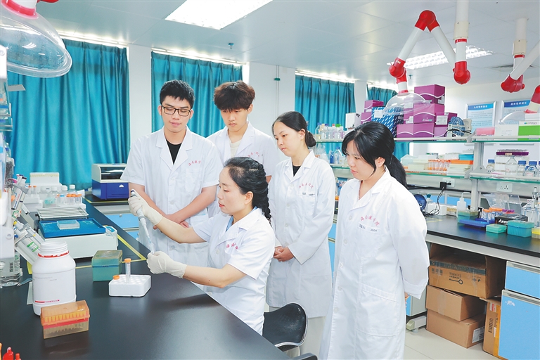 海南医科大学培养的第一位长江学者马燕琳(中)正带领学生做试验。