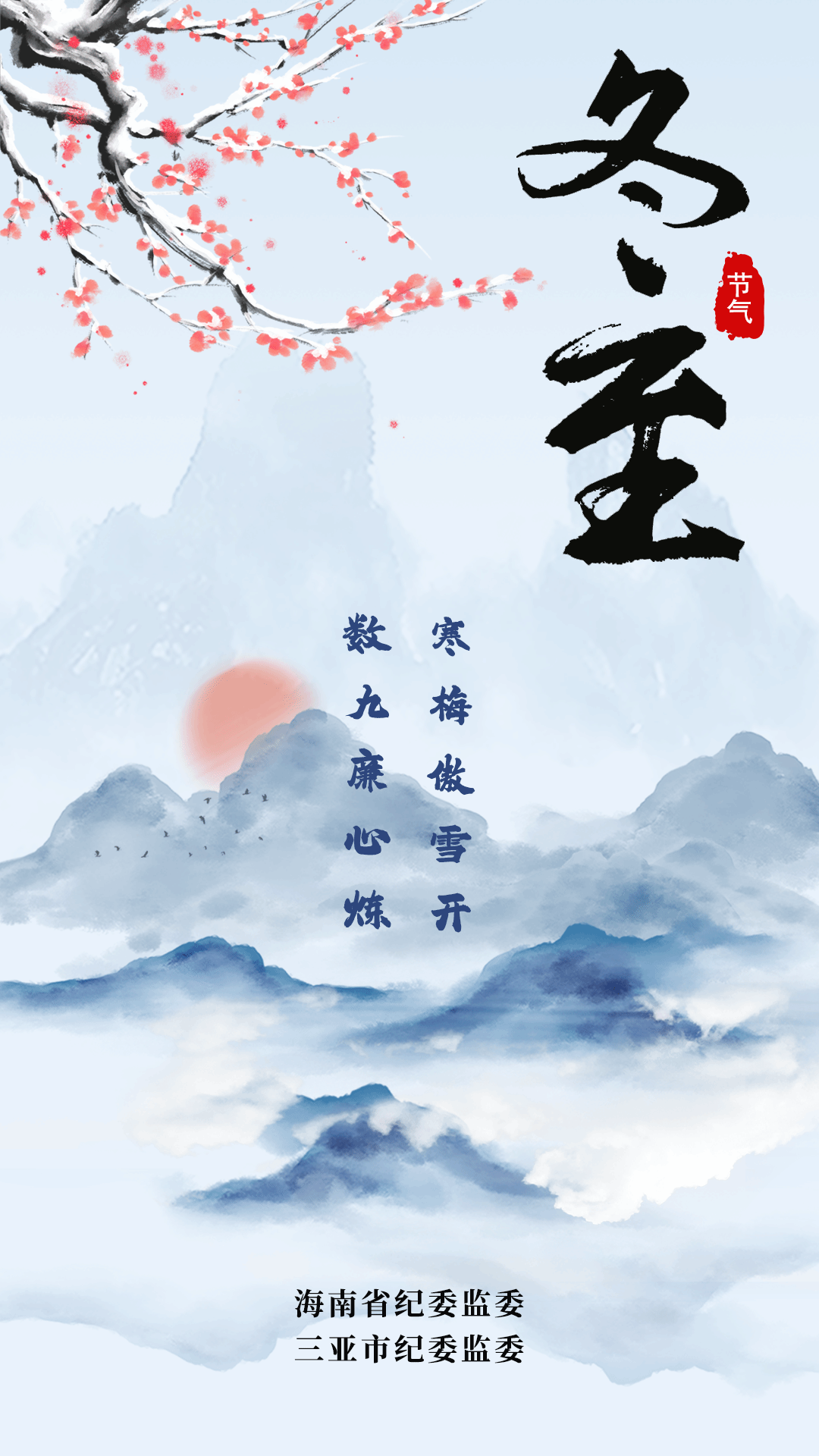 天时人事日相催,冬至阳生春又来。冬至时节,当常思贪欲之害,如凛冬之寒能摧折万物;常怀律己之心,如初生之阳可煦暖身心。全省广大党员、干部要固本培元、增强党性,始终保持“赶考”的清醒,日积尺寸之功,以清正廉洁的奋斗姿态迎接自由贸易港建设“春暖花开”。