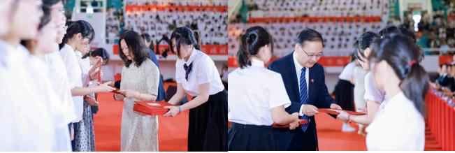 (2025级新生开学典礼上,贺国华女士和党委副书记张巍为获奖学生颁奖)