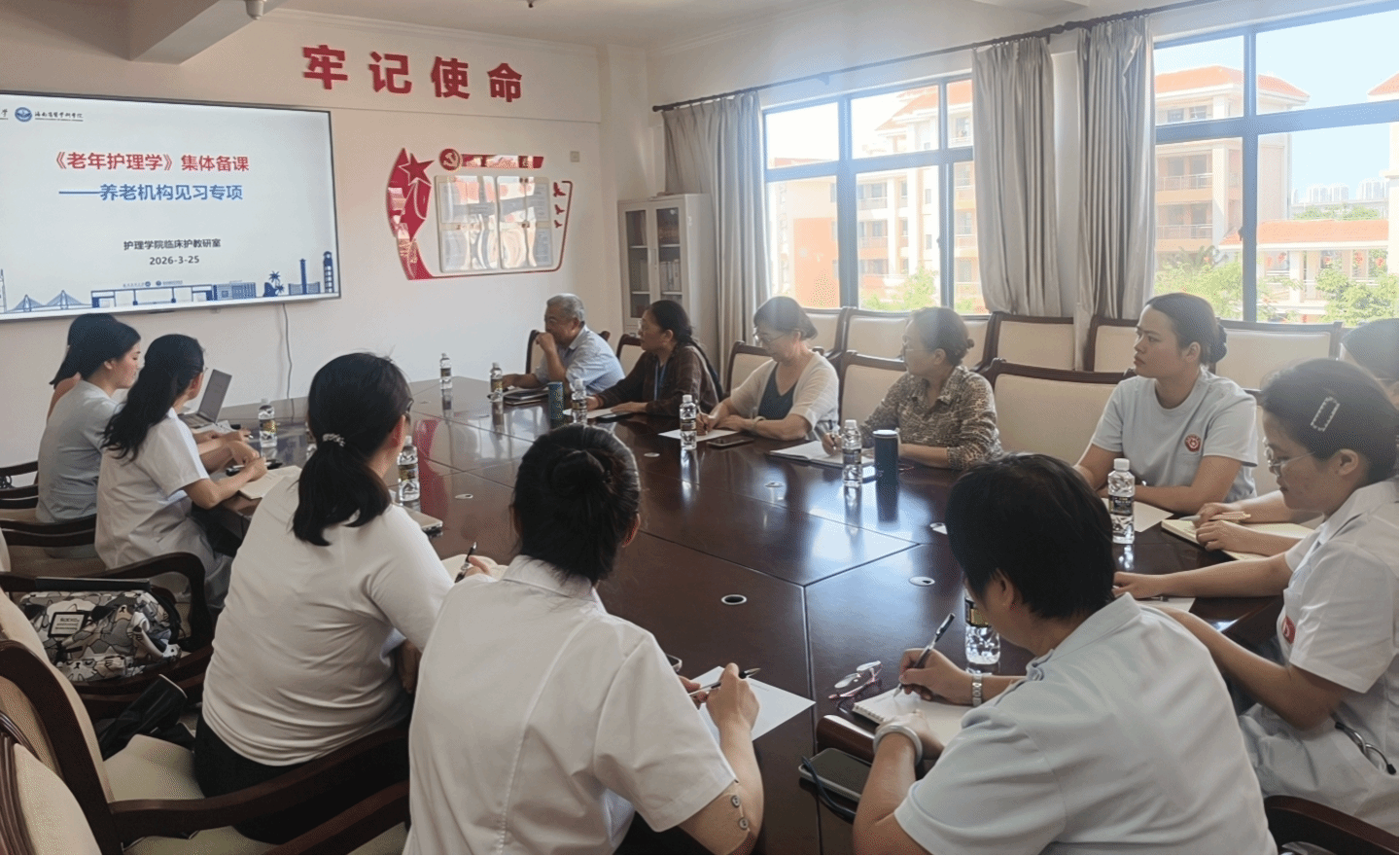 为推进院院融合背景下护理学专业“2+2”人才培养模式落地,深化老年护理学课程实践教学改革,提升养老机构见习带教质量与同质化水平,2026年3月25日,海南医科大学护理学院临床护理教研室在海南省托老院会议室成功举办老年护理学课程养老机构见习专项教研活动。海南医科大学校级教学督导组副组长梁平教授、第三教学督导小组组长唐历波教授、校级教学督导曹卫洁教授和高湲教授全程精心指导,学院与附属医院“院院融合”的老年护理学课程团队骨干教师及海南省托老院全体见习带教老师共同参与,围绕见习教学核心问题展开深度研讨。